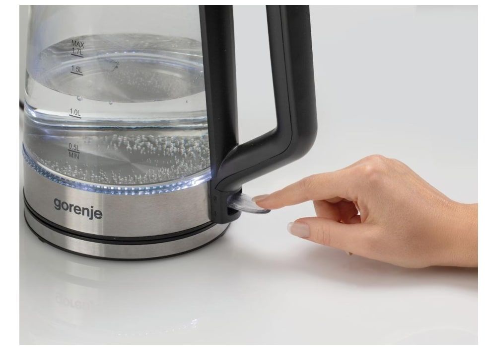 Модель обладнана термостатом Strix і автоматично вимикається після закипання води, а також у разі перегрівання. Шнур живлення електрочайника Gorenje K17GE змотується і зберігається в спеціальному відсіку.