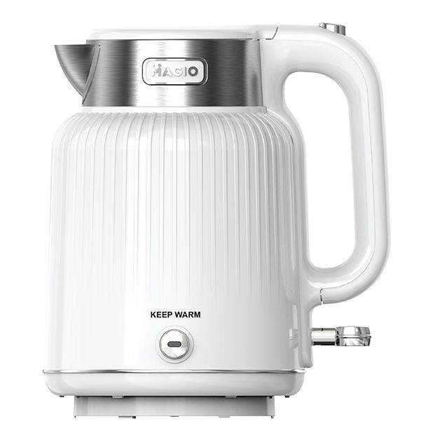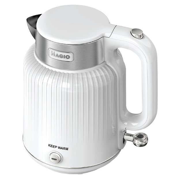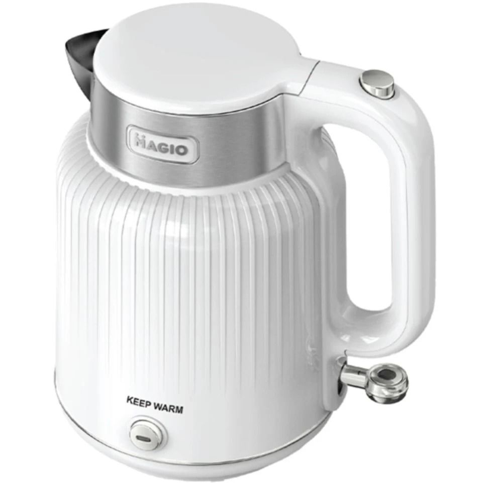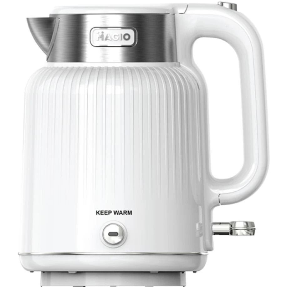 Електрочайник Magio MG-508 - це чудовий електричний чайник з корпусом з високоякісного пластику білого кольору. З потужністю 2000 Вт він швидко закип’ятить воду, при тому, що вміщує дана модель цілих 1,7 літрів, чого цілком достатньо для сім’ї. Індикатор рівня води дозволяє контролювати кількість води в чайнику. Для зручності він повертається на підставці на 360 градусів. Технічними перевагами електрочайника Magio є наявність фільтру від накипу, візуальний індикатор рівня рідини в приладі і опція автоматичного відключення після закипання. Чайник легко очищається за допомогою вологої губки або серветки.