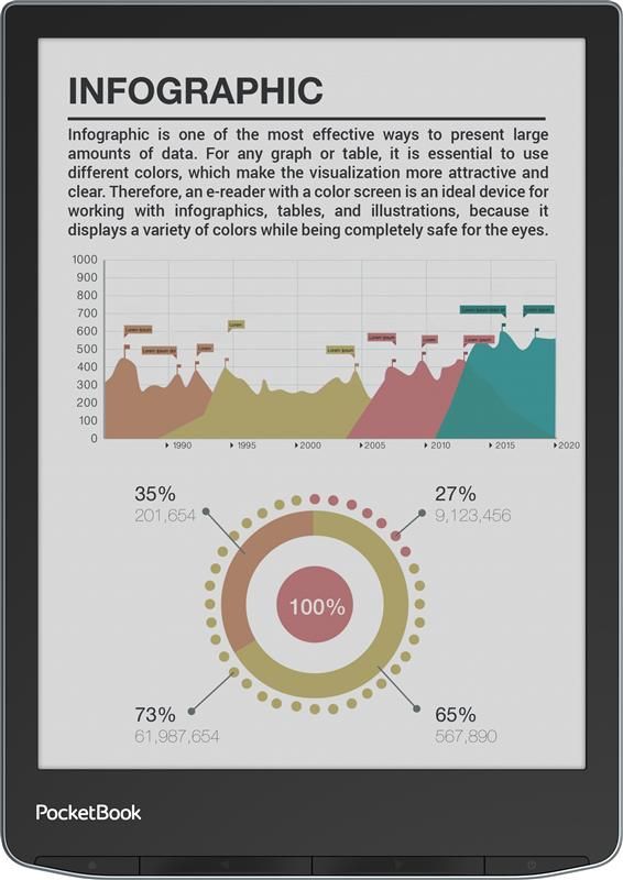 PocketBook InkPad Color 3 оснащений оновленим 7,8-дюймовим кольоровим екраном E Ink Kaleido 3, здатним відображати 4096 кольорів, залишаючись при цьому абсолютно безпечним для зору. Завдяки вдосконаленому кольоровому фільтру, новий екран забезпечує кращу насиченість кольорів зображення, що зробить ілюстрований контент ще яскравішим і привабливішим. Екран з діагоналлю 7,8 дюймів максимально наближений за розміром до сторінки друкованої книжки, що забезпечує максимальний комфорт читання. Насолоджуйтесь будь-яким контентом у кольорі: дитячими книжками з ілюстраціями, коміксами та манга, діловою та науковою літературою, періодичними виданнями тощо.