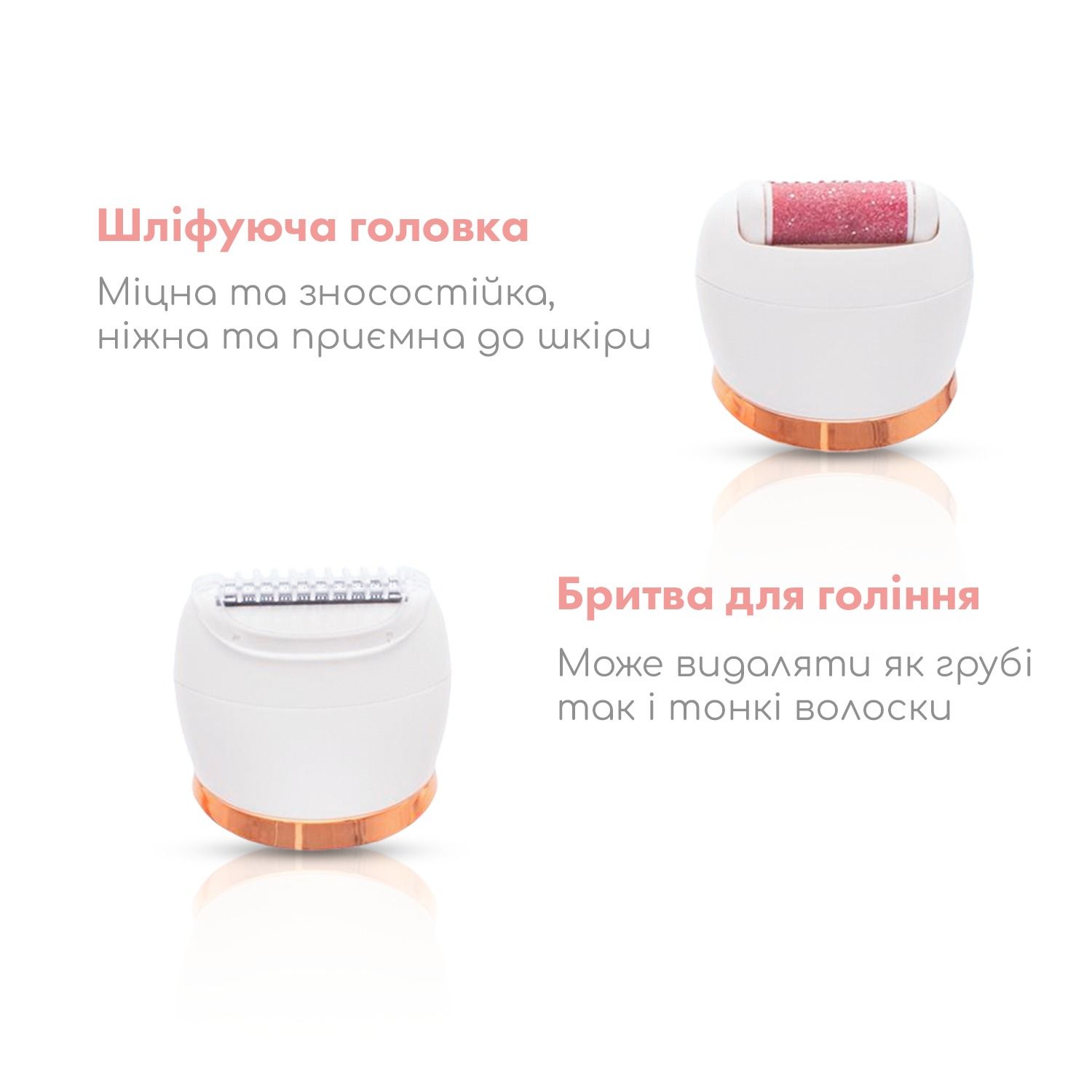 Також ідеально підходить для гоління волосся на руках, ногах, пахвах та лініях бікіні. Знімна головка та довга щітка для чищення роблять його легким у догляді. Різні шліфувальні головки для ніг, з двома типами кварцових пісків, дозволяють вам вибрати оптимальний метод для догляду за шкірою.