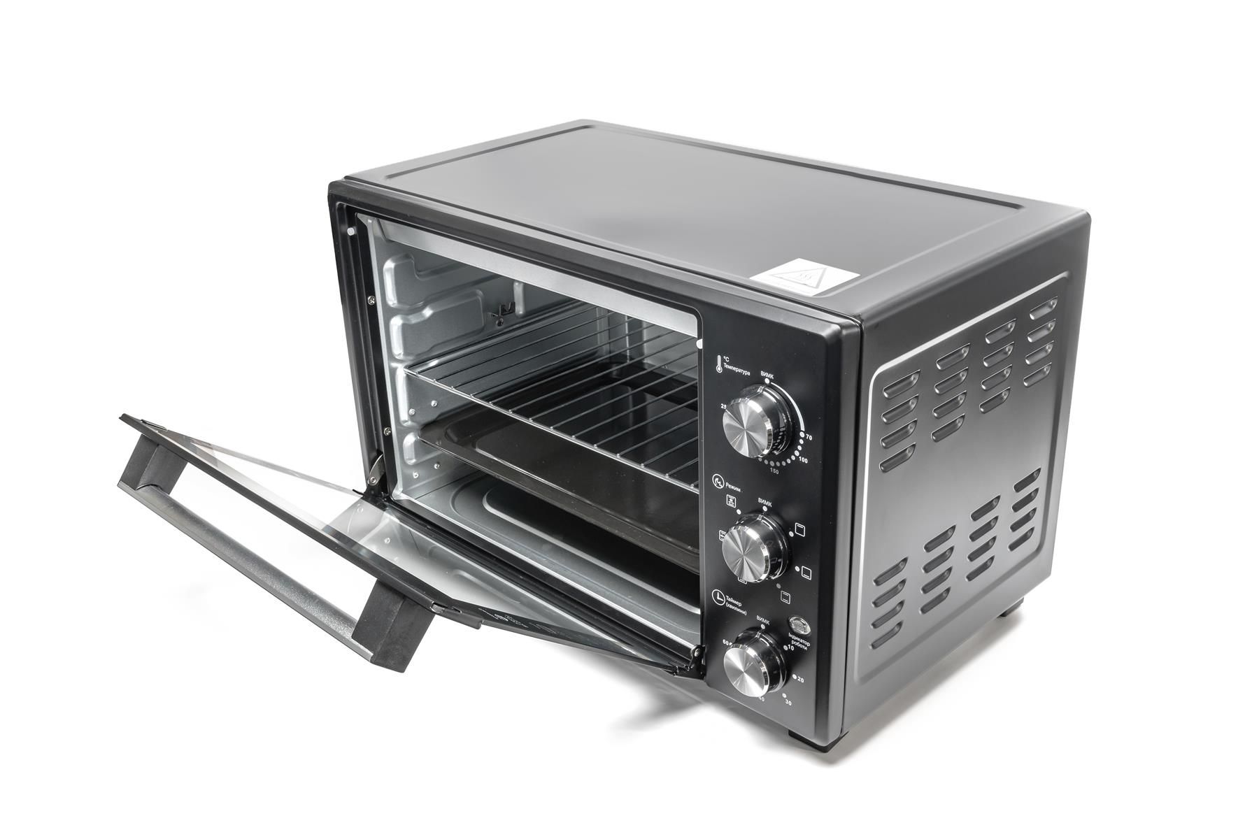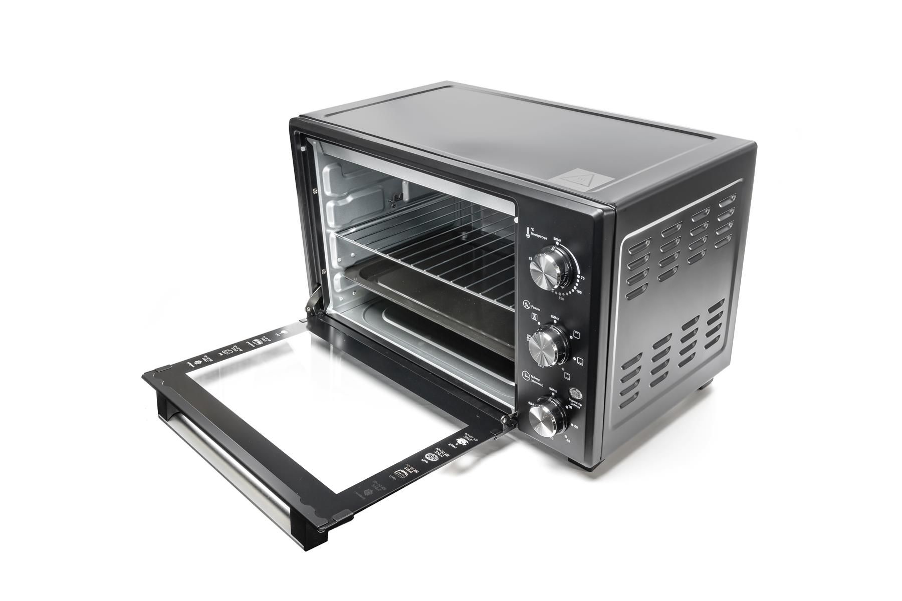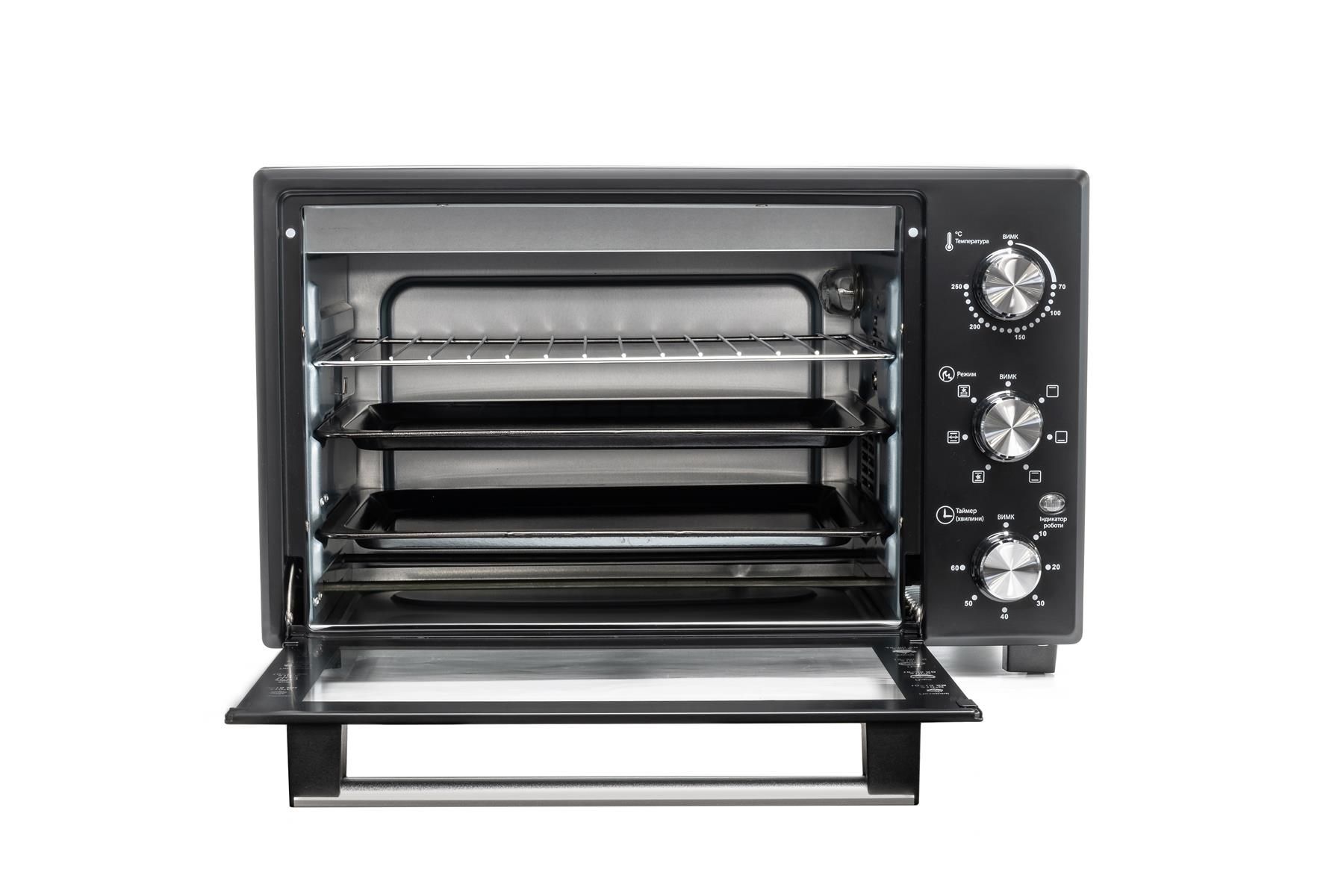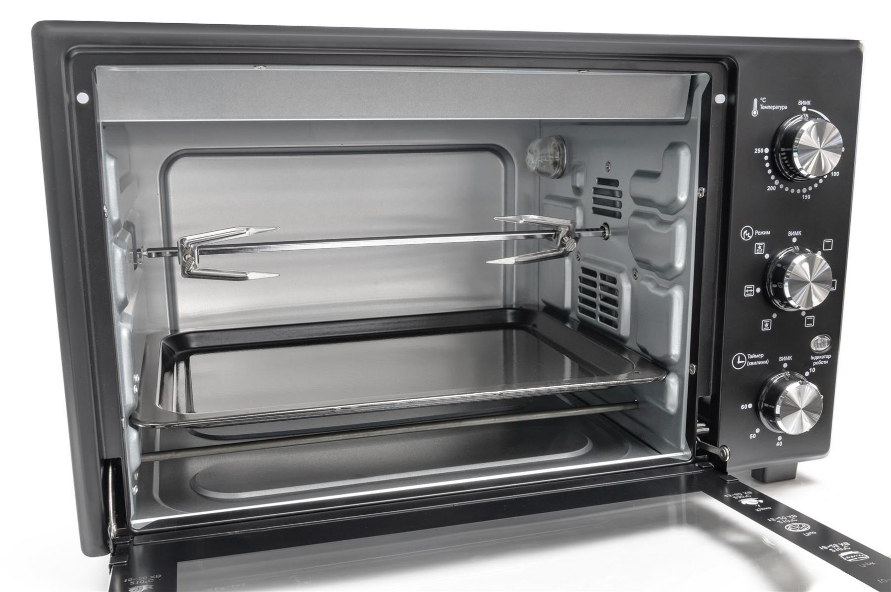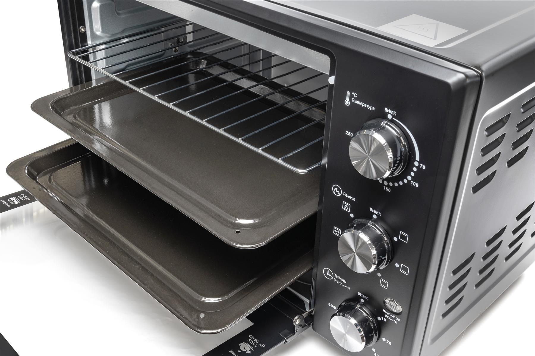 На лицьовій панелі електропечі розташований механічний регулятор температури. Термостат дозволяє встановлювати температуру від 70°С до 250°С. Така можливість настройки теплового режиму дозволяє готувати страви, як при сильному нагріванні (при 250°С), так і при легкому термічному впливі. Блюда не пригорають навіть при високій температурі, бо гаряче повітря всередині печі розподіляється рівномірно.