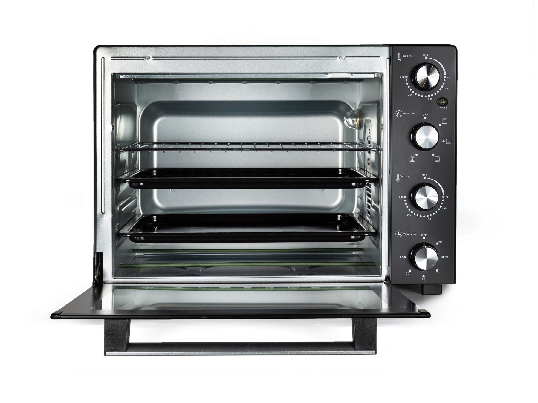 На лицьовій панелі електропечі розташований механічний регулятор температури. Термостат дозволяє встановлювати температуру від 100°С до 250°С. Така можливість настройки теплового режиму дозволяє готувати страви, як при сильному нагріванні (при 250°С), так і при легкому термічному впливі. Блюда не пригорають навіть при високій температурі, бо гаряче повітря всередині печі розподіляється рівномірно.