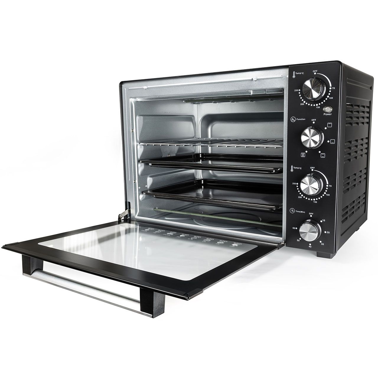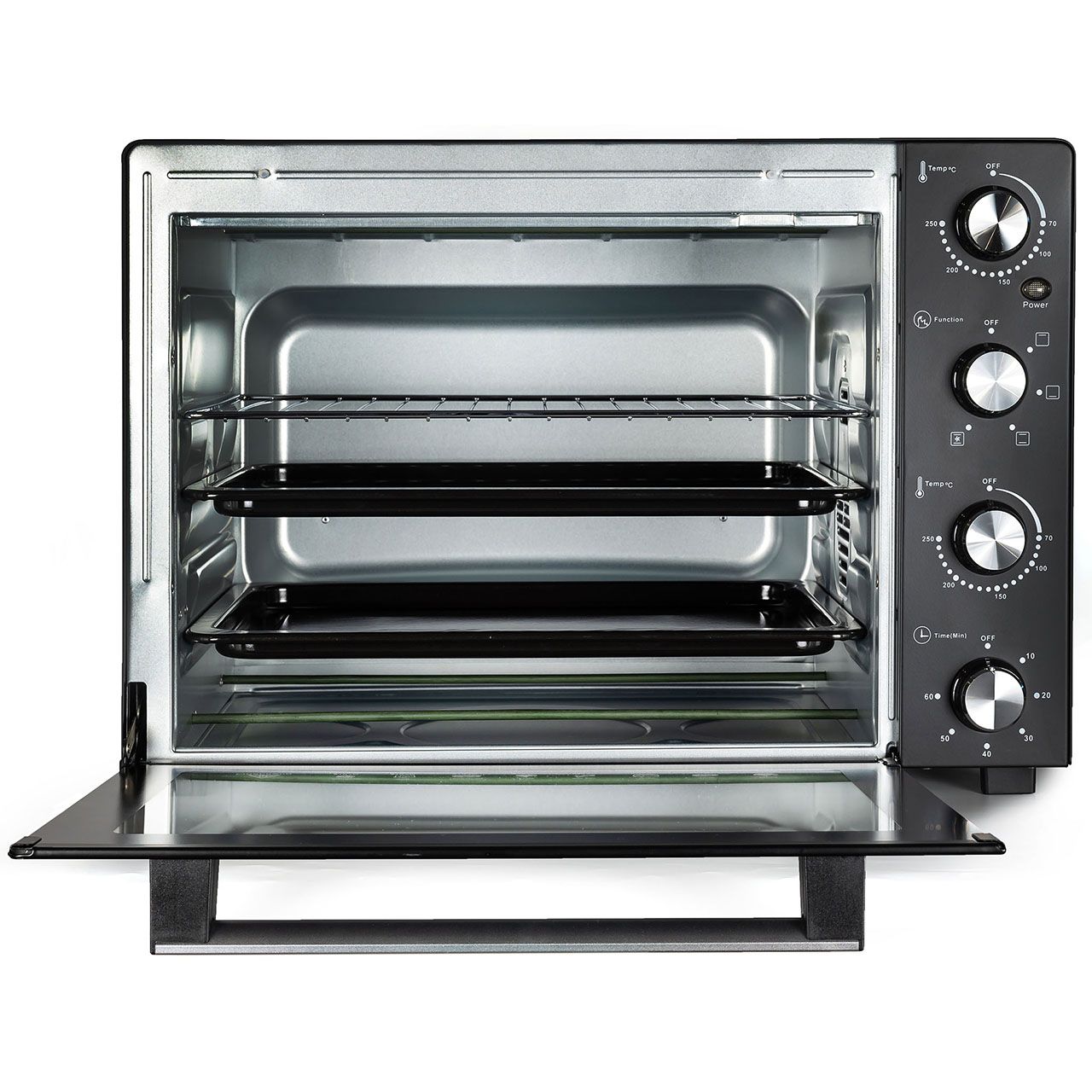 Корпус печі виготовлений з якісних матеріалів: сталь, пластик і скло. Нагрівальні елементи з нержавіючої сталі забезпечують надійність і довговічність пристрою. Чорний колір корпусу додає елегантності та гармонійно поєднується з будь-яким кухонним інтер’єром. Внутрішнє підсвічування та світловий індикатор роботи допоможуть вам стежити за процесом приготування без необхідності відкривати дверцята.