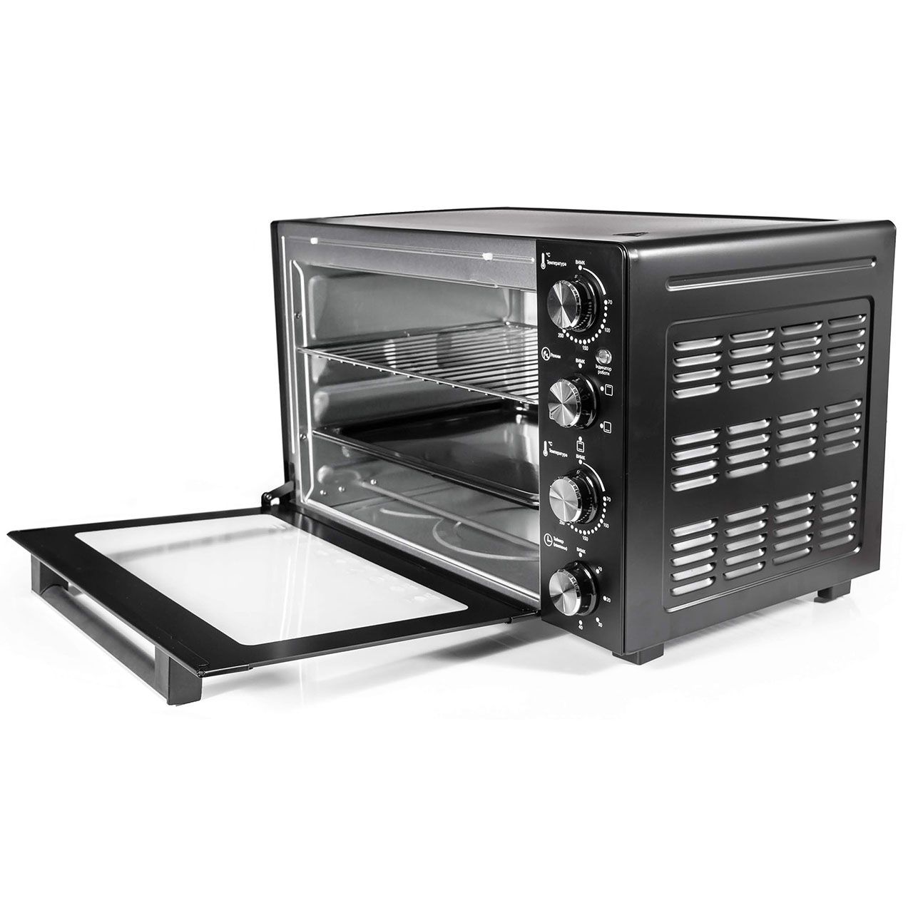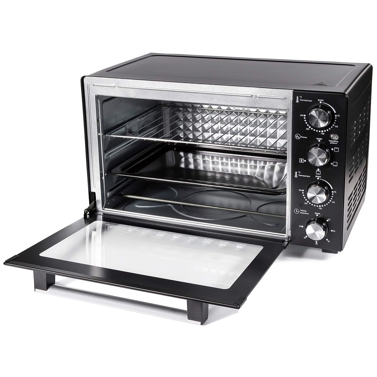 Механічне керування дозволяє швидко обрати один з режимів роботи – верхній або нижній нагрів, комбінований режим чи режим з конвекцією, завдяки якому страва рівномірно пропікається з усіх боків. Таймер до 60 хвилин з функцією автовимкнення та звуковим сигналом додає зручності у використанні та забезпечує повний контроль над процесом.