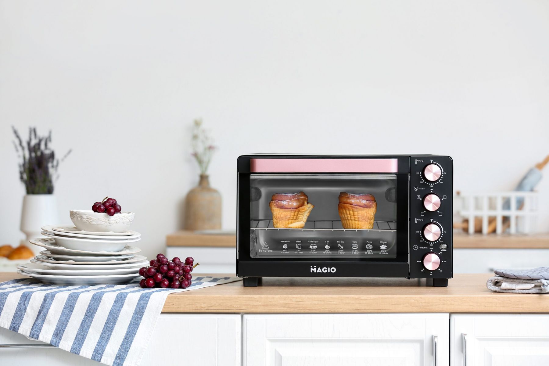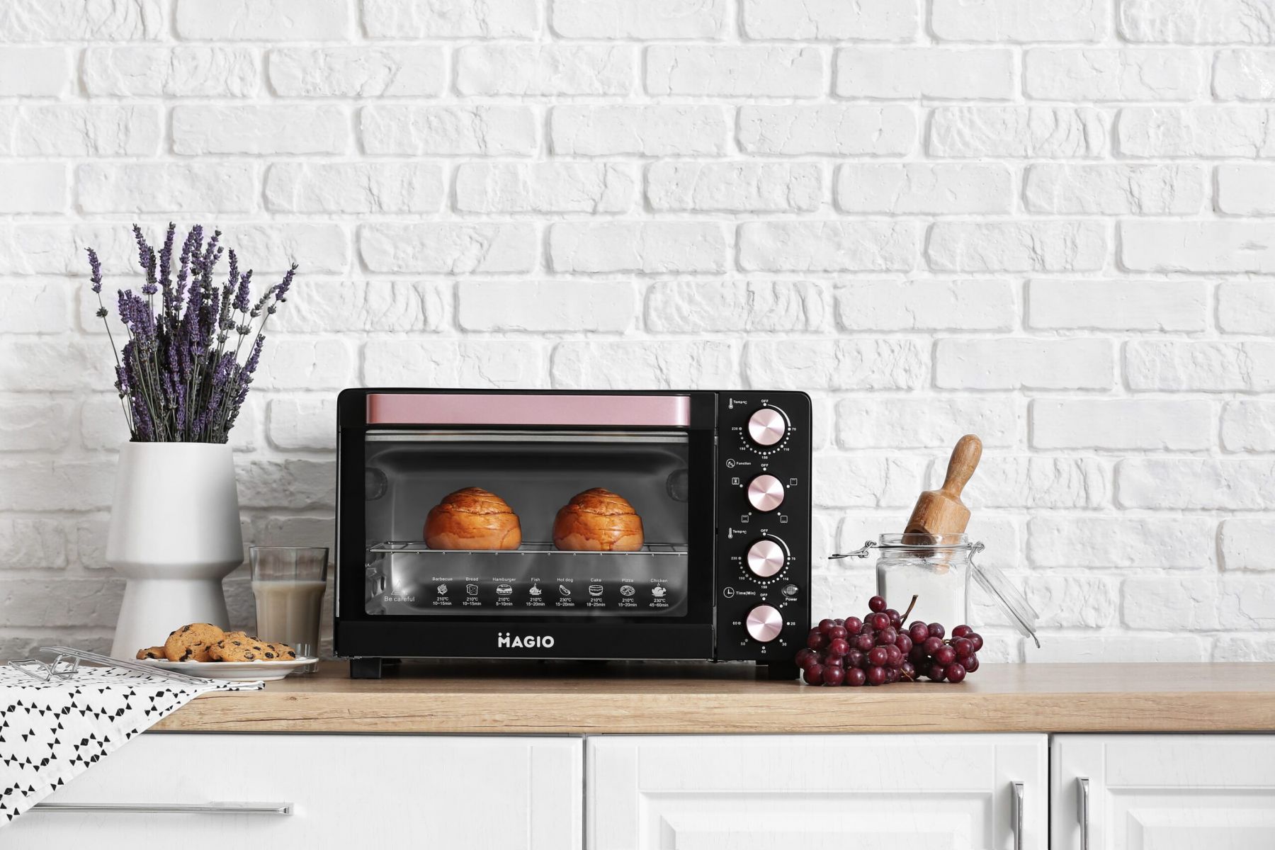 Компактна електропіч MG-247 потужністю 1500 Вт забезпечує оптимальний результат приготування. Внутрішній об’єм складає 20 літрів, чого цілком вистачить, якщо ви плануєте готувати страви для своєї родини. 6 автоматичних режимів дозволяють готувати безліч найрізноманітніших страв. Прилад оснащений регулятором температури 100-250°С і таймером на 60 хвилин. Режим конвекції рівномірно розподіляє тепло всередині приладу, піч працює як конвекційна духовка. У комплекті є все необхідне для готування: піддон, знімна решітка, знімна ручка.