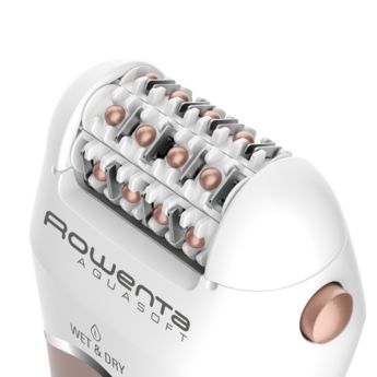 Видаляйте волосся дбайливо, швидко і без побічних ефектів з новим епілятором Rowenta Aquasoft. Завдяки запатентованій технології проти роздратування Anti-Irritation і спеціальному м"якому покриттю насадки епілятор ефективно видаляє волоски, не дратуючи шкіру. Корпус епілятора на 100% водонепроникний, тому пристрій можна використовувати як на сухій шкірі, так і під час прийняття душу або ванни, адже вода чинить додаткову заспокійливу дію на шкіру під час епіляції.