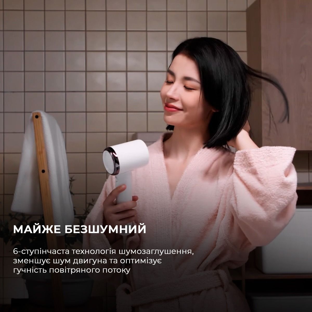 Інше:11 додаткових режимів, захист від перегріву, безщитковий двигун зі швидкістю 120 000 об/хв для потужної циркуляції високошвидкісного повітряного потоку; повітря викидається під тиском із швидкістю до 70 м/с; магнітна вішалка дозволяє зручно зберігати пристрій; магнітна насадка з можливістю обертання на 360 ° 6-шарова технологія шумоподавлення ( рівень шуму всього близько 56 дБ)
