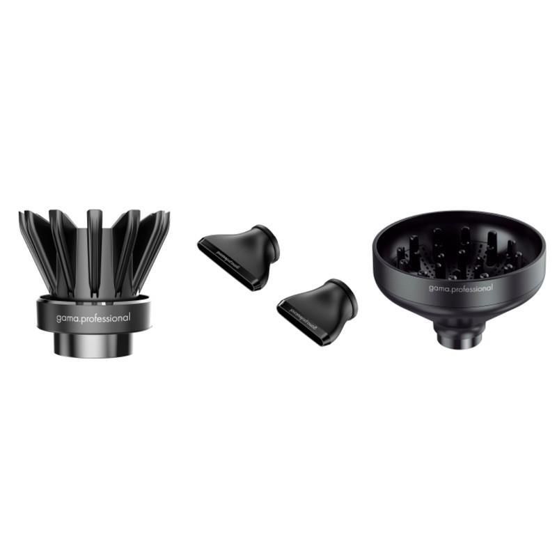 В комплекті:фен, 2 насадки концентратора, насадка дифузора, насадка-зірка з ефектом Вентурі, магнітна знімна муфта для підвішування, щіточка для очищення фільтрів, килимок GAMA Smart Pad, документація