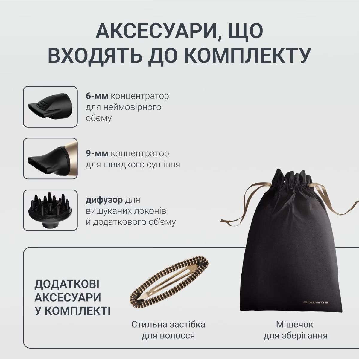 В комплекті:фен, дифузор, концентратор 6 мм, концентратор 9 мм, знімна решітка, чохол, заколка, інструкція