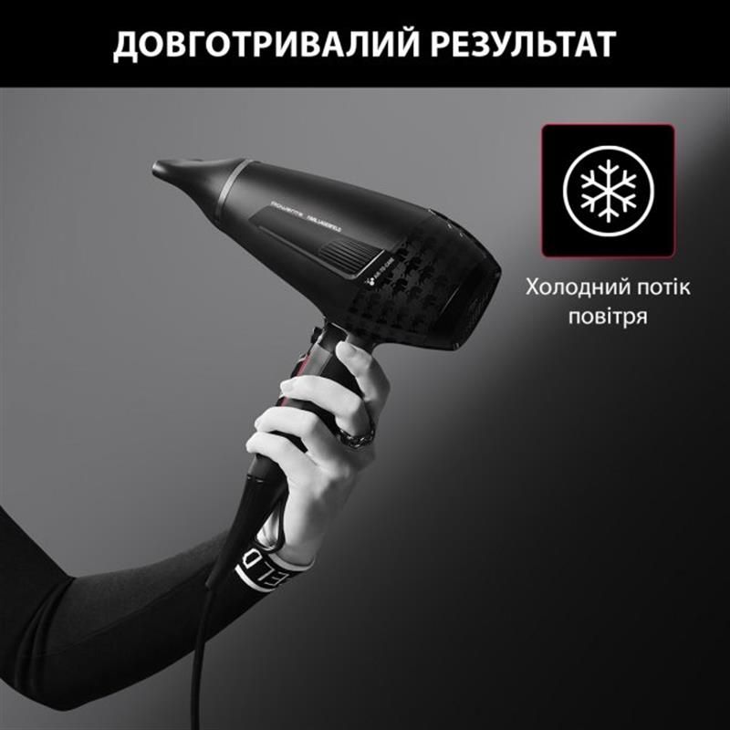 Фен Rowenta x KARL LAGERFELD K/Pro Stylist CV888LF0. Колекція преміум-класу Rowenta x KARL LAGERFELD містить передову технологію, яка проста у використанні та дає вам можливість створювати бездоганний образ, щоразу пропонуючи безмежні можливості, впевненість і стиль.Наша співпраця — це універсальна колекція продуктів, створена для людей, які щодня хочуть мати результати як з перукарні чи барбершопу. Усі вироби виконані в преміальному дизайні чорного кольору з фірмовим візерунком KARL LAGERFELD.