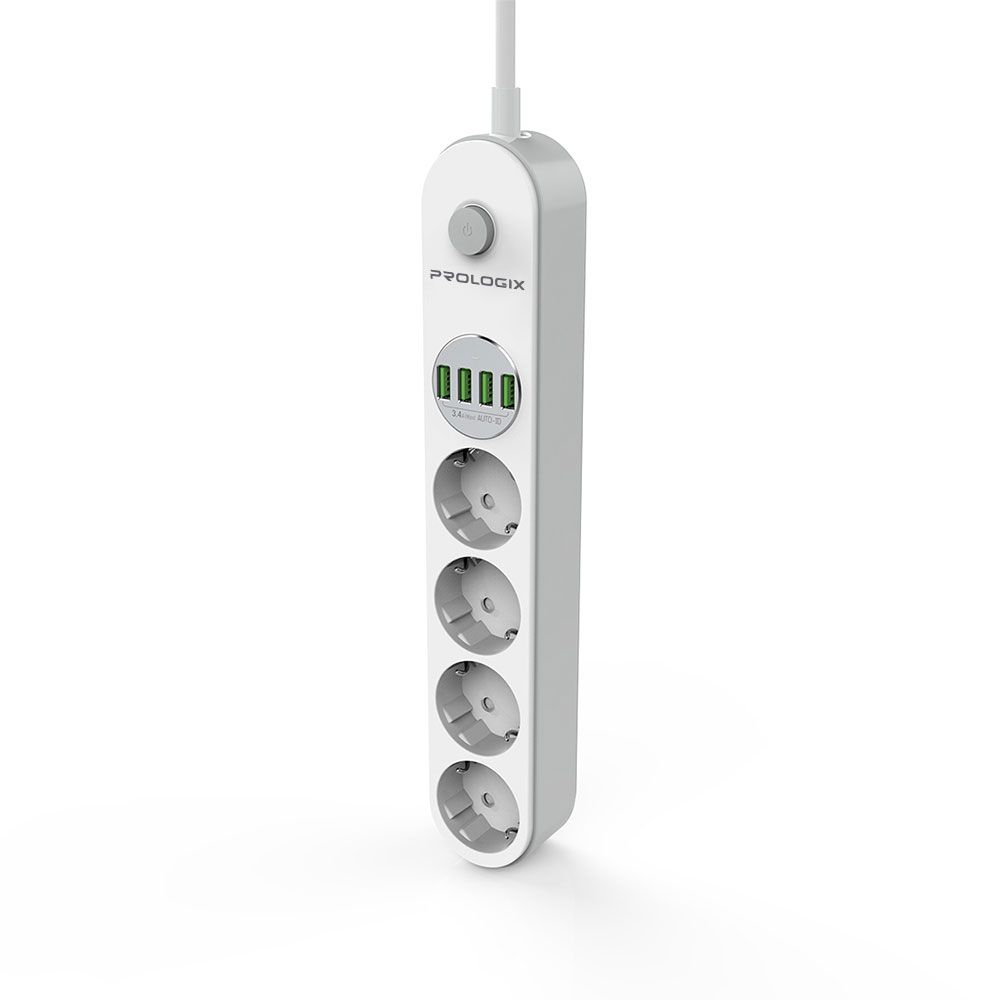 Бренд ProLogix пропонує мережевий фільтр PR-SE4432W. Він має 4 розетки та 4 порти USB. Виконаний у корпусі з вогнетривкого пластику, захищений від перенавантажень та коротких замикань. Також пристрій оснащено спеціальним отвором, що дозволяє повісити його на стіні.