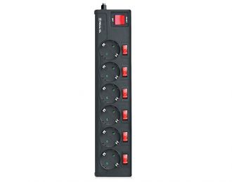 Особливості мережевого фільтра харчування: загальний двополюсний вимикач з вбудованим запобіжником і світловою індикацією. Індивідуальні вимикачі для кожної розетки. 6 розеток із заземленням і захисними шторками. Відновлюваний запобіжник не вимагає заміни. Кабель з чистої міді без використання сплавів.