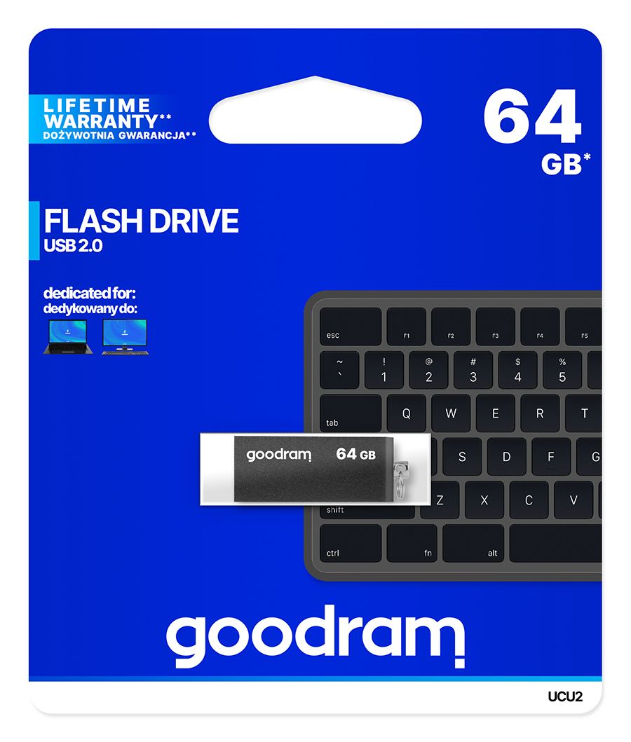Goodram Ucu2 - флеш-накопичувач невеликого розміру, виготовлений з анодованого алюмінію, є міцним носієм даних, який може бути прикріплений до ключів або зберігатися в гаманці. Завдяки цьому важливі дані, фотографії або улюблені фільми завжди будуть під рукою у користувача. Goodram Ucu2 характеризується унікальним поворотним механізмом відкриття роз"єму, а використана для його виготовлення технологія COB робить цей невеликий носій даних ударостійким і водостійким.