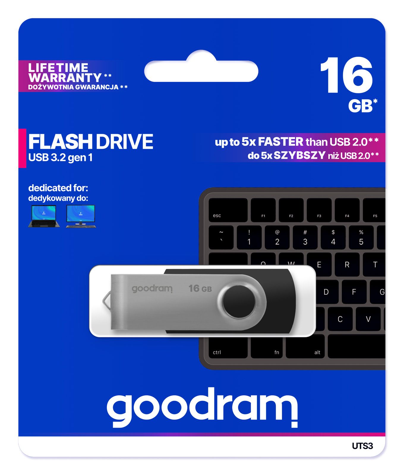 Універсальність і функціональність - це найважливіші властивості GOODRAM UTS3. Міцний корпус з металевою поворотною скобою не тільки чудово захищає дані, що зберігаються, але і дозволяє не турбуватися про ковпачок, який може загубитися. GOODRAM UTS3, на відміну від аналогічних продуктів на ринку, характеризується фірмовими компонентами і довічною гарантією а також швидким інтерфейсом 3.0.