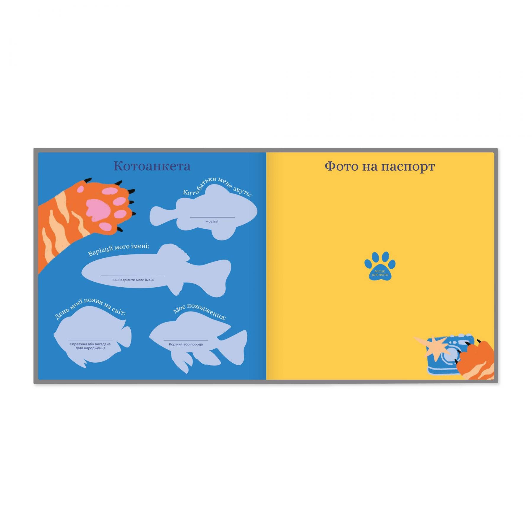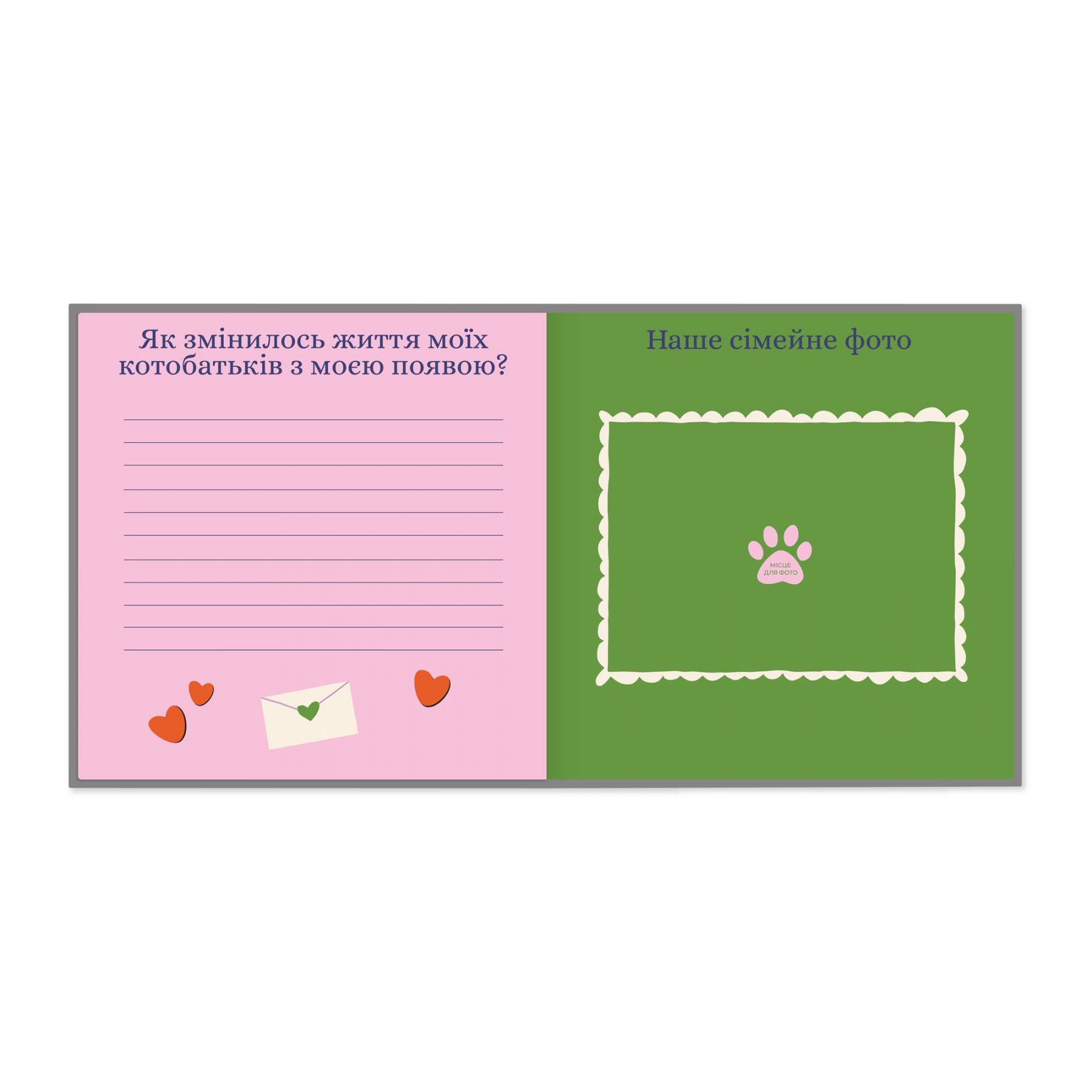 Ось які ще розділи містить цей фотоальбом: перший день народження, улюблені місця та пози для сну, цікавинки поведінки, біографічні відомості, перша подорож, гороскоп, тест на сумісність, перший день вдома, розпорядок дня.