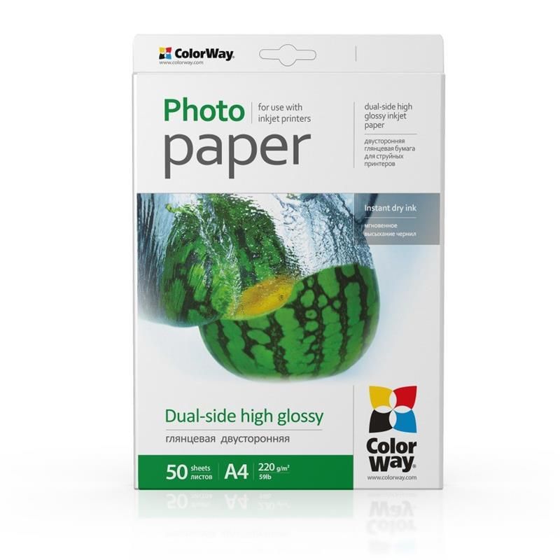 Глянцевий двосторонній папір ColorWay для струменевого друку. Має з обох сторін аркуша гладку, глянцеву вологозахищену поверхню. Ідеально підходить для друку фотореалістичних проспектів, рекламних листків, карток і т.д. Миттєво вбирає водорозчинні чорнила. При друку пігментним чорнилом рекомендовано просушувати кожну сторону відбитку щоб запобігти змазуванню з поверхні. Ідеально передає яскраві, насичені кольори з безліччю відтінків. Зберігати в сухому місці в стороні від сонячного світла. Температура зберігання від 5° С до 25° С. Не містить шкідливих для здоров"я речовин. Надруковані знімки рекомендовано зберігати в альбомах або в рамках під склом. Ця модель паперу призначена тільки для друку на струменевому принтері та персонального використання.