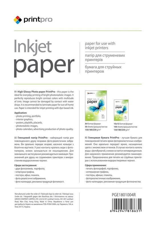 Глянцевий фотопапір PrintPro для повсякденного струменевого і лазерного друку. Має гладку, глянцеву поверхню. Завдяки паперовій основі і помірним ступенем глянцю, папір підходить для друку фотографій і графіки, як на струменевих, так і лазерних принтерах. Має гарні властивості по вбиранню чорнил та закріпленню тонера. При друку пігментним чорнилом рекомендовано просушувати відбиток щоб запобігти змазуванню з поверхні. Зберігати в сухому місці в стороні від сонячного світла. Температура зберігання від 5°С до 25°С. Не містить шкідливих для здоров"я речовин. Надруковані знімки рекомендовано зберігати в альбомах або в рамках під склом. Ця модель паперу призначена тільки для друку на струменевому принтері та персонального використання.