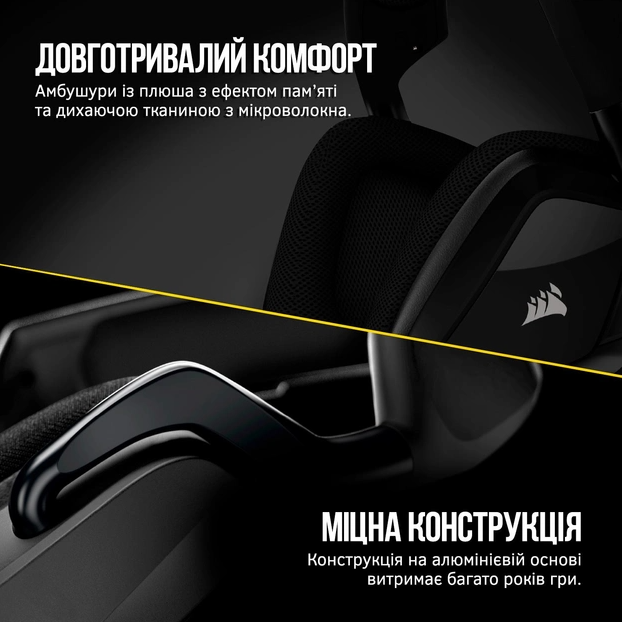 Пориньте у світ подій з CORSAIR VOID ELITE SURROUND, оснащеним індивідуально налаштованими 50-міліметровими неодимовими аудіодінамікамі, зручною сіткою з мікрофібри з амбушюрами з піни з ефектом пам’яті і всеспрямованим мікрофоном.