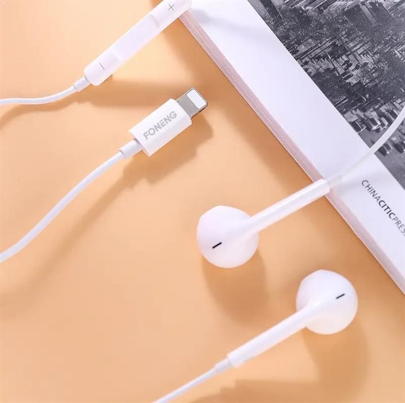 Дротові навушники FONENG T28 Lighting Earphone for iPhone мають панель керування, завдяки якій можна перемикати пісні та регулювати гучність. Довжина дроту становить 120 см. Кабель виконаний із силікону, а самі навушники із пластику.