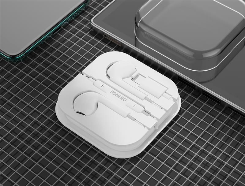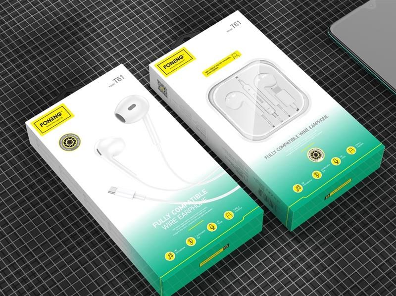 Дротові навушники FONENG T61 мають панель керування, завдяки якій можна перемикати пісні та регулювати гучність. Довжина дроту становить 120 см. Кабель виконаний із силікону, а самі навушники із пластику.