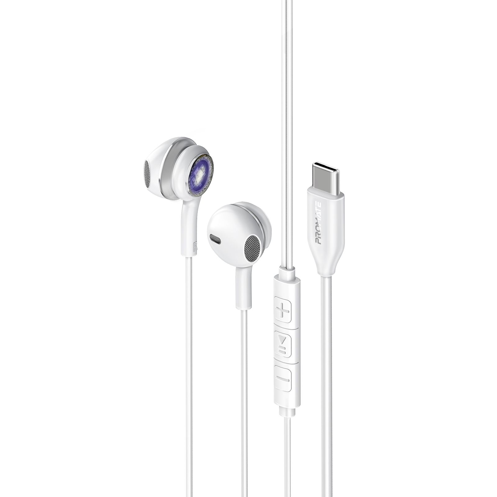 LumiBuds-C від Promate - дротові навушники-вкладиші з USB-C конектором. Глибокі баси, HD мікрофон і ергономічний корпус роблять їх ідеальними для прослуховування музики.