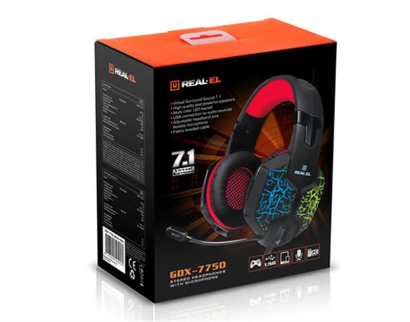 Ігрові стереонавушники з мікрофоном REAL-EL GDX-7750 забезпечують відтворення реалістичного та об"ємного і звуку 7.1, що надає змогу відчути усю потужність спецефектів і повного ефекту присутності у грі. Сумісні з Медіа-програвачами і ПК.