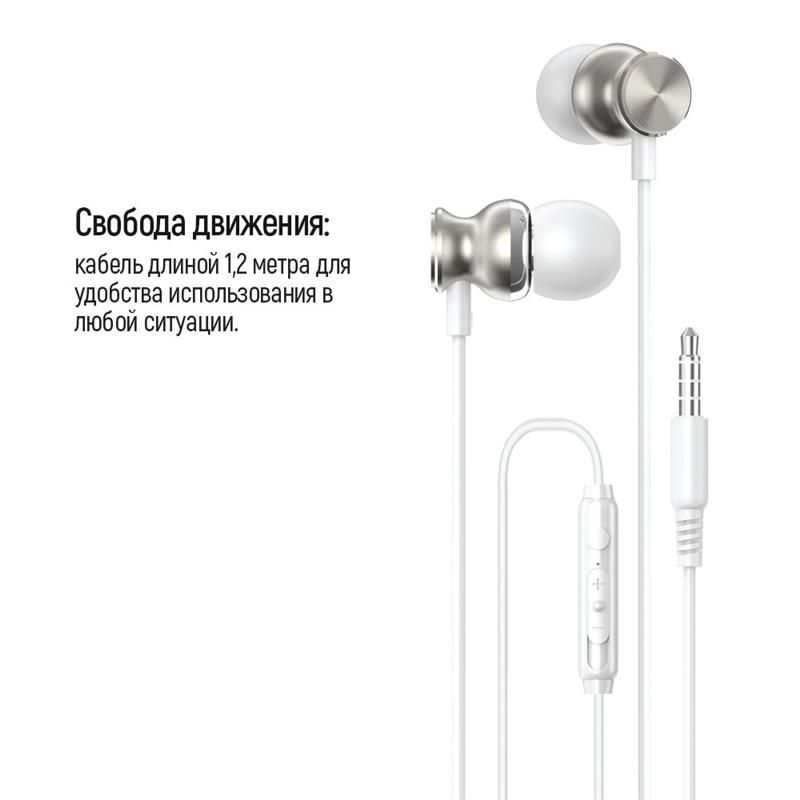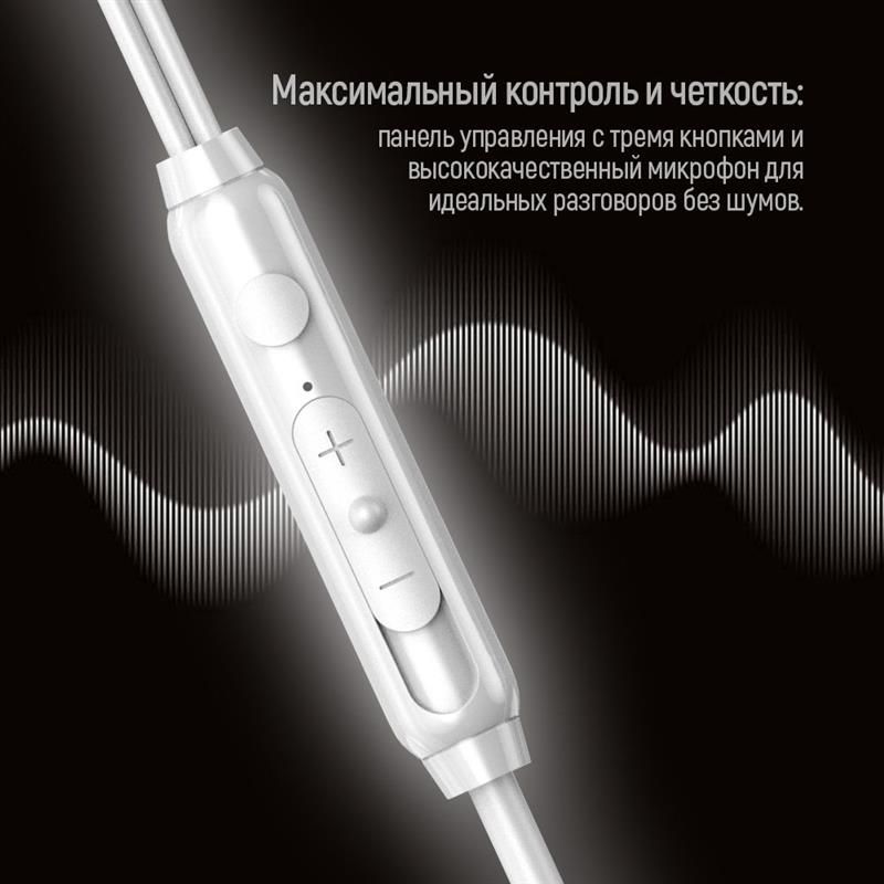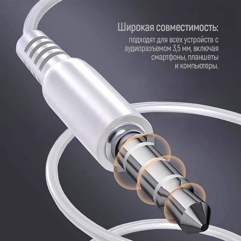 Ці дротяні навушники оснащені роз’ємом 3,5 мм, а довжина кабелю становить 1,2 метри. На кабелі розташована панель керування з трьома кнопками та високоякісний мікрофон, що забезпечує чітку передачу голосу під час розмови та знижує небажані шуми.