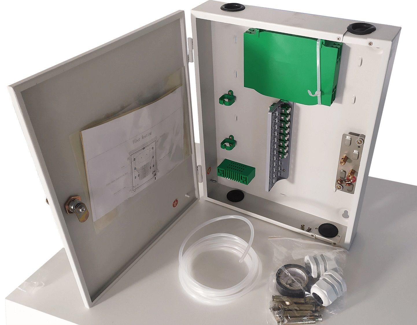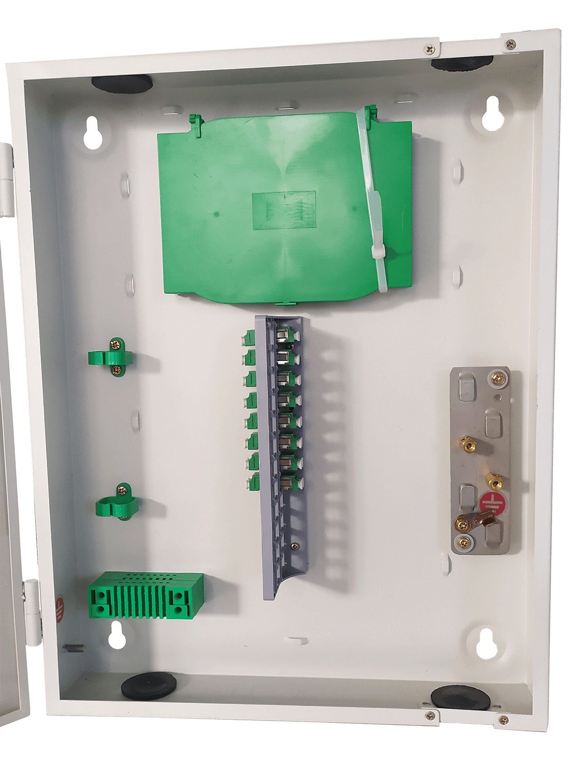 Ущільнювальні втулки введення кабелів оберігають бокс від проникнення пилу та водяних бризок. Має в комплекті 8 адаптерів LC Duplex із можливістю встановлення до 24 шт. та сплайс-касету на 24 волокна, а також комплект кріплення та аксесуарів.