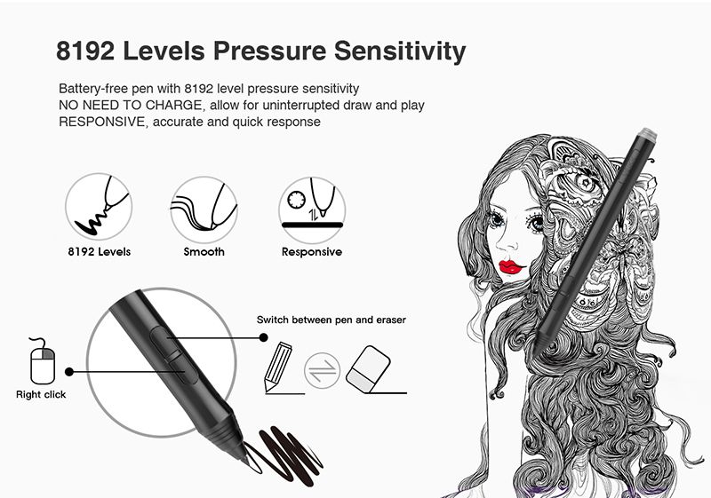 Цифрове перо пасивне, не потребує зарядки і має рівень чутливості 8192 тисків. Відсутність необхідності заряджання стілус дозволяє малювати в будь-який час, грати швидко, плавно. На панелі пера розміщено дві клавіші, де одна налаштована на праву клавішу миші, друга на перемикання між пером та гумкою.