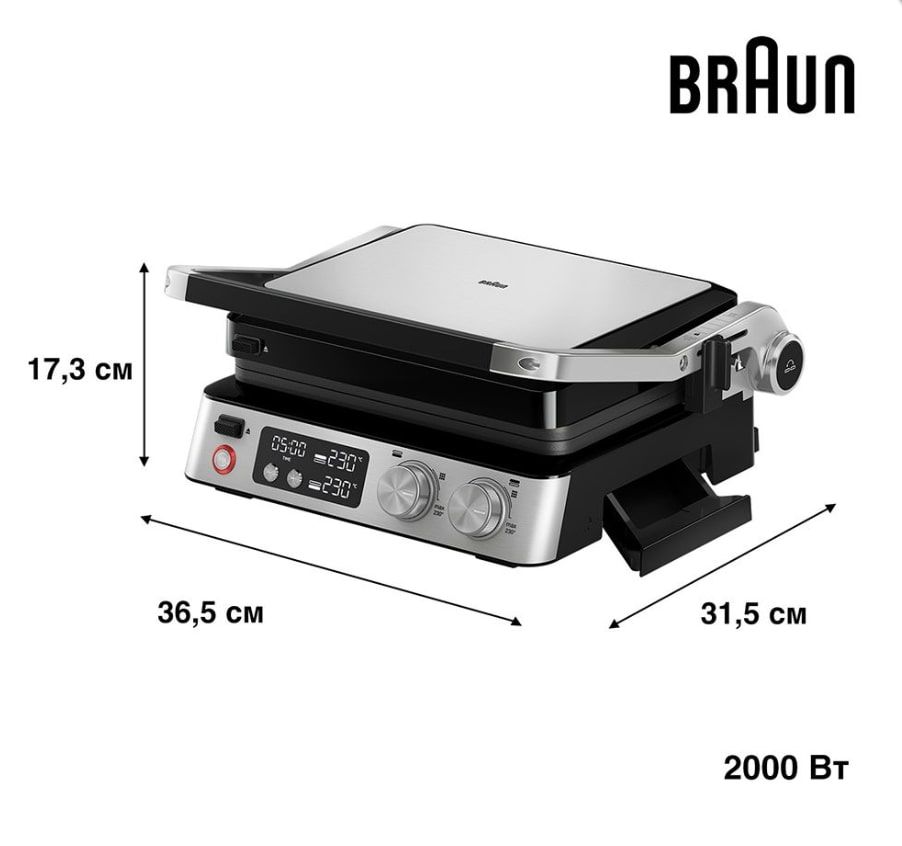 Додатково:незалежні зони нагріву, відкриття на 180°, пластини можна мити в посудомийній машині, регулювання положення пластин, регульовані задні ніжки