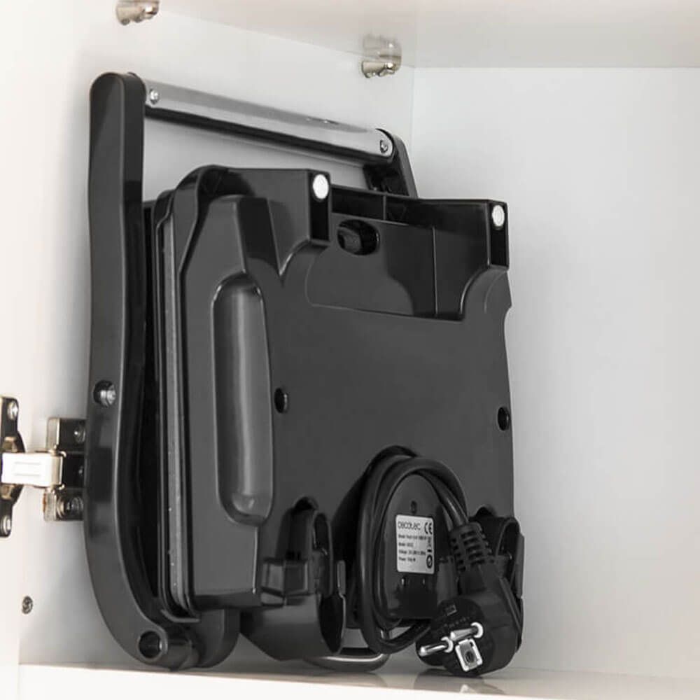 Поглиблення для кабелю і затиск, який утримує пластини разом, дозволяють зберігати гриль у вертикальному положенні, щоб він не займав багато місця.