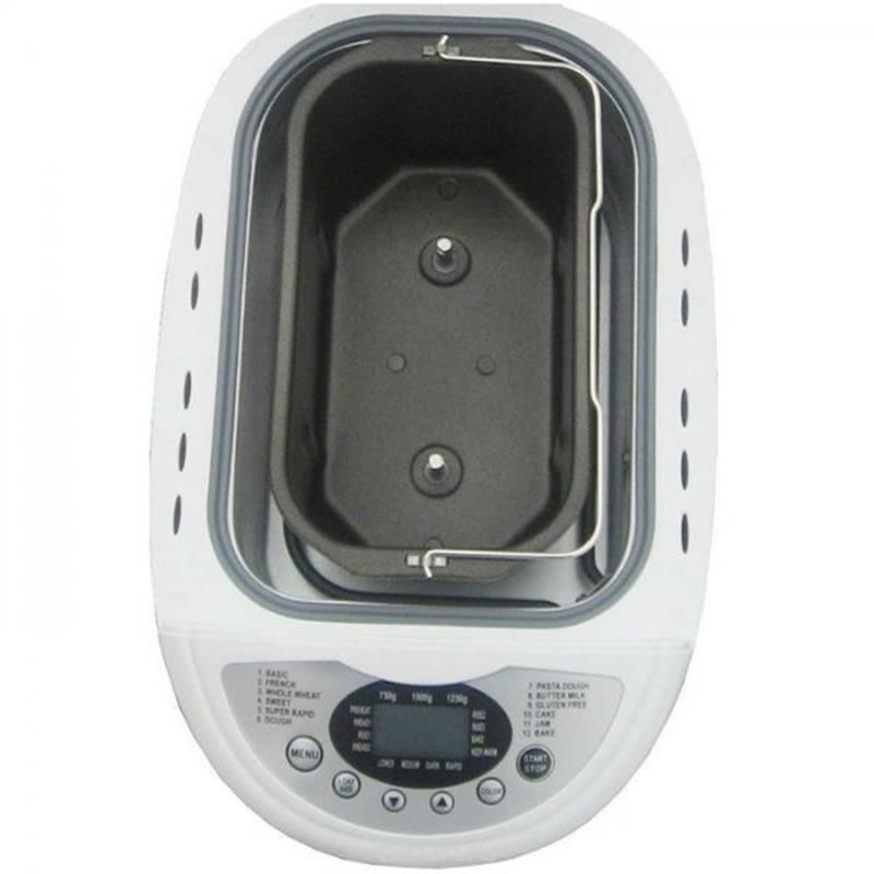 Максимальна місткість форми - 1250 г, котрого більш ніж достатньо, щоб спекти хліб для всієї родини. Потужність хлібопічки: 850 Вт, але нехай Вас це не лякає, вона споживає не так багато електроенергії. Форма має антипригарне покриття - тефлон, яке легко піддається очищенню. Також, воно підходить для миття в посудомийній машині. За допомогою оглядового вікна Ви зможете поспостерігати за процесом випікання. Дисплей, розташований на панелі приладів, інформує про програму випічки, режимі роботи на даний момент і часу до закінчення.