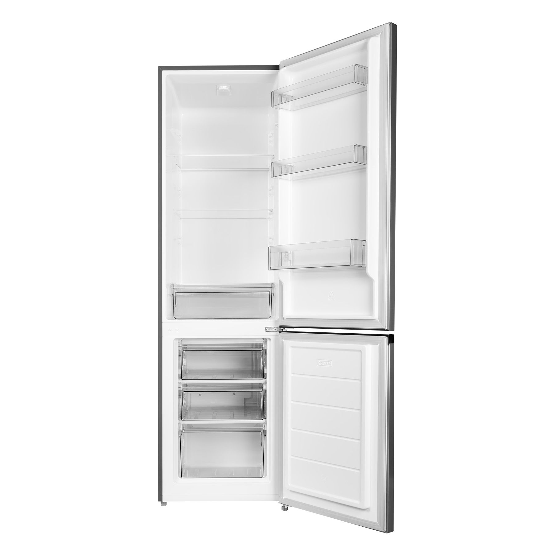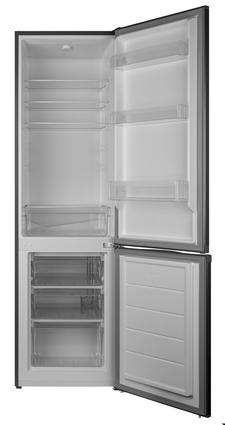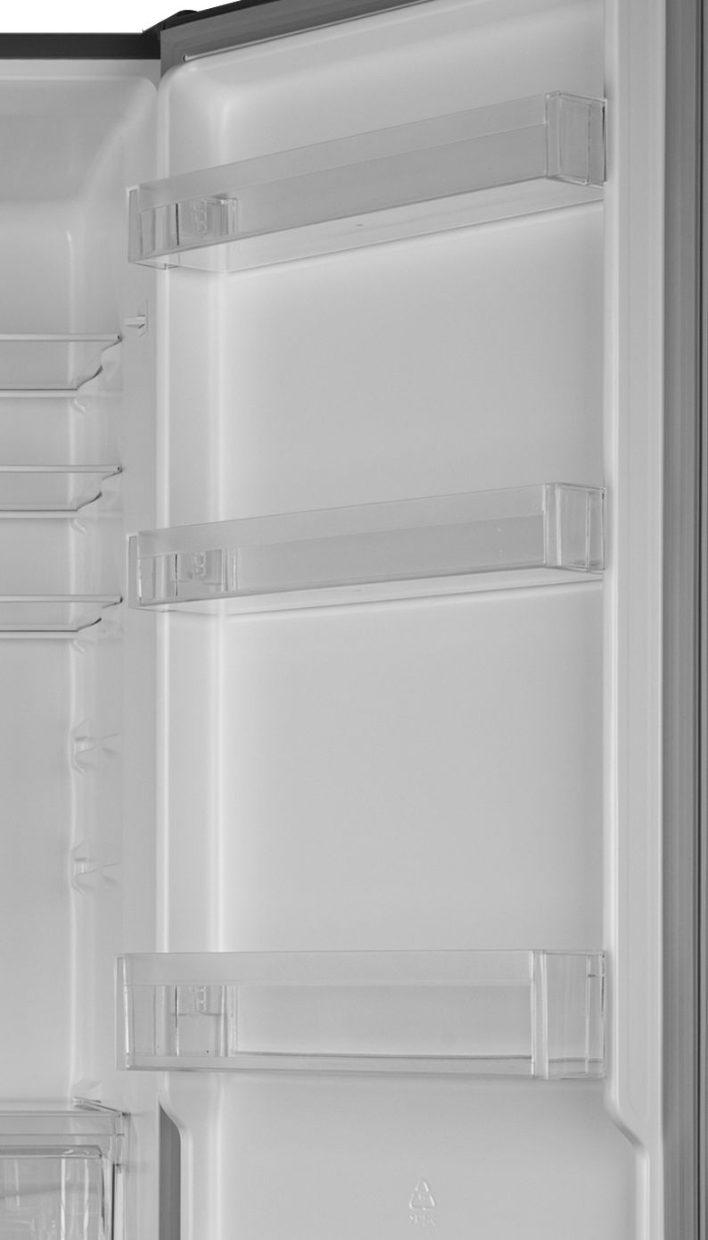 Є механічне керуванння і ручний процес розморожування, а також статистична охолоджувальна система. Плоский дизайн дверей не залишить байдужим нікого. Двері та корпус зроблені з металу, прихована ручка - із пластику. Верхній матеріал - пластик. Весь користувацький інтерфейс розташований всередині, тип LED. Усередині холодильника можна налаштувати потрібний температурний режим. Є додаткова функція відключення відсіку для збереження свіжості.