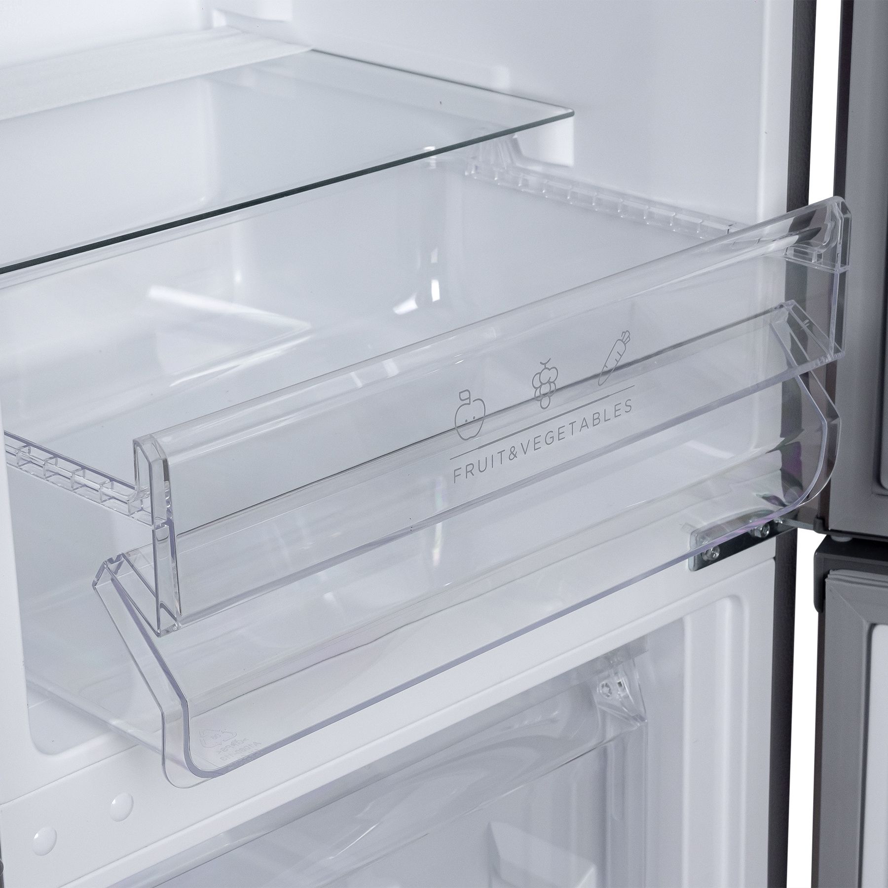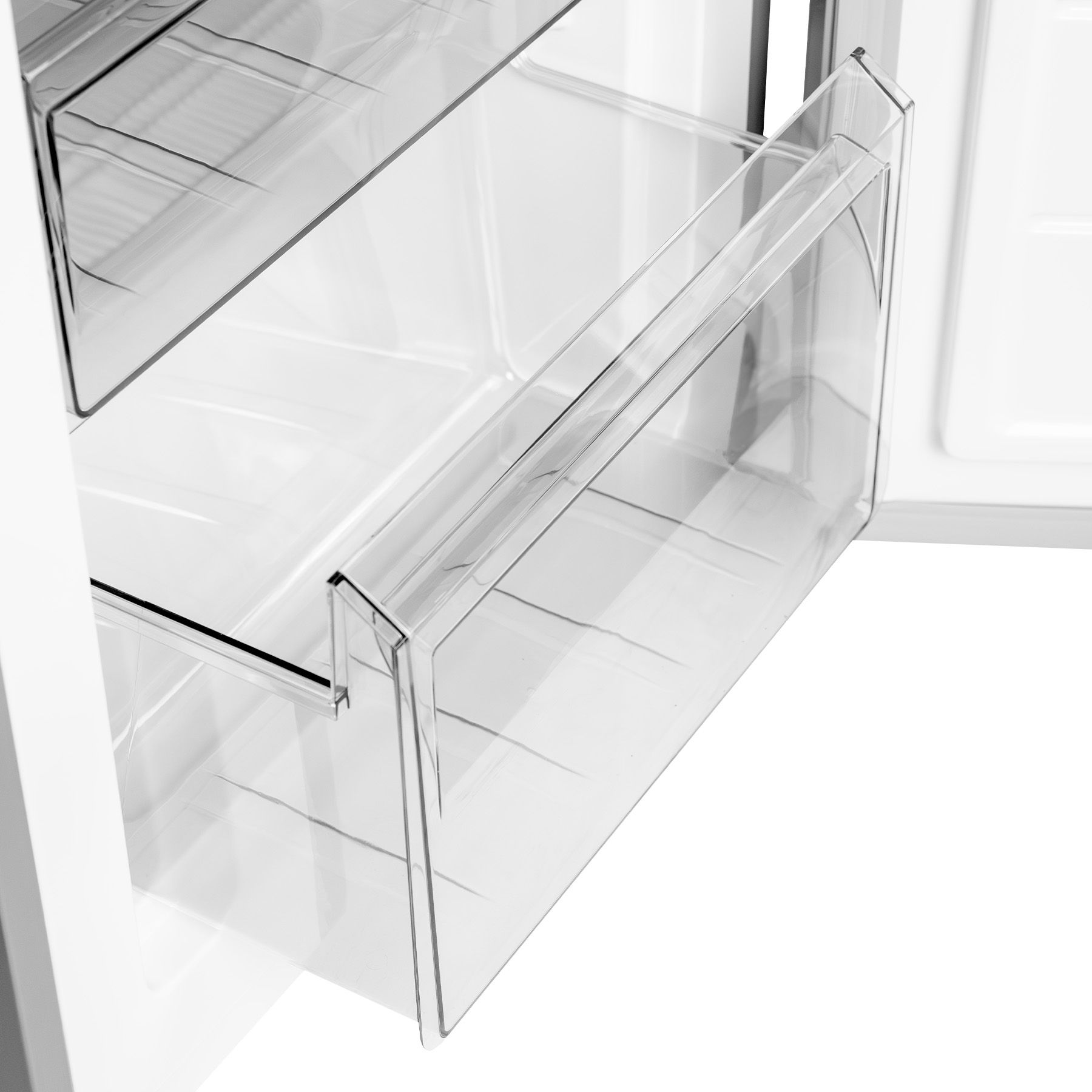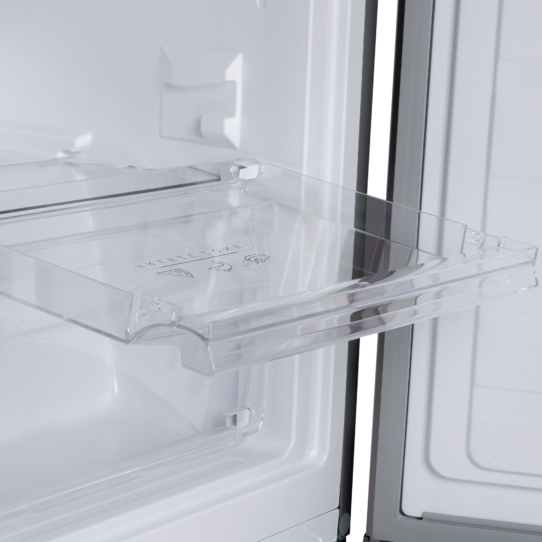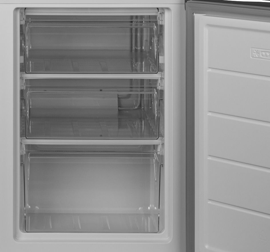 Холодильний відсік має напівпрозорий плафон лампи, що не перешкоджає LED-освітленню, яке розташоване зверху. Три полиці виконані зі скла з пластиковим огранюванням. Є три продуктові пластикові шухляди, один кріспер-бокс із пластику зі скляною кришкою та пластиковим обмеженням. Морозильна камера - це три ящики для заморожування продуктів. За бажання можна додати лоток морозилки, а за додаткову суму - підставку для заморожування льоду й окремий відсік для неї.