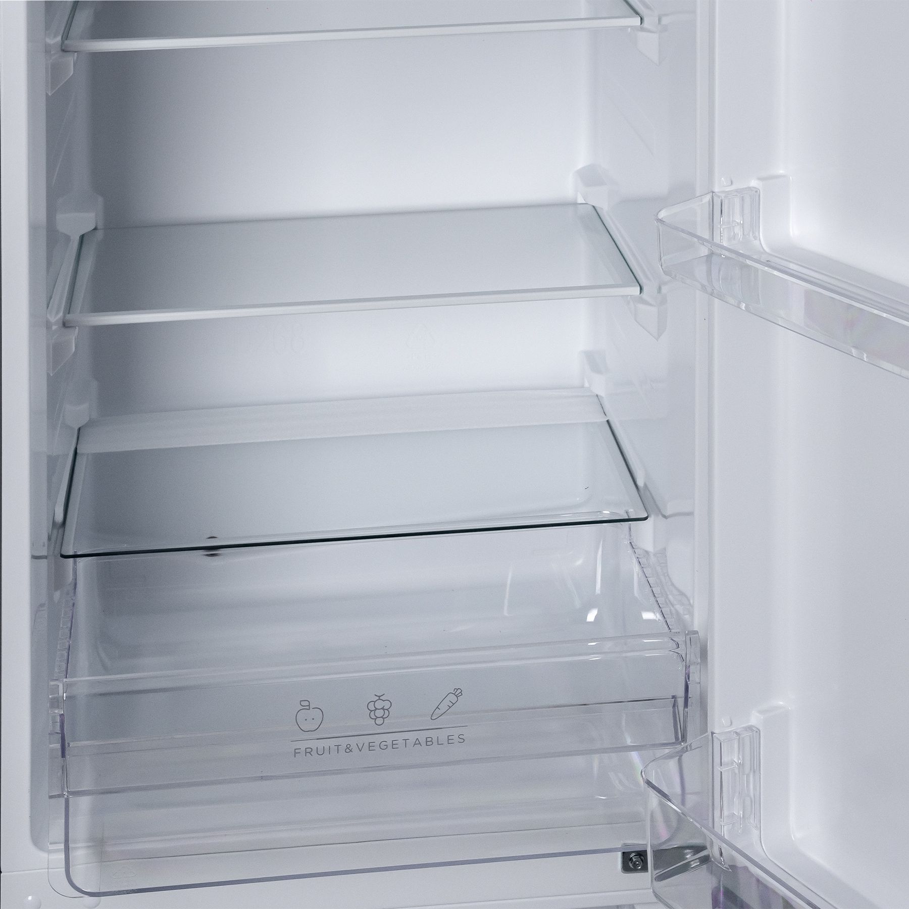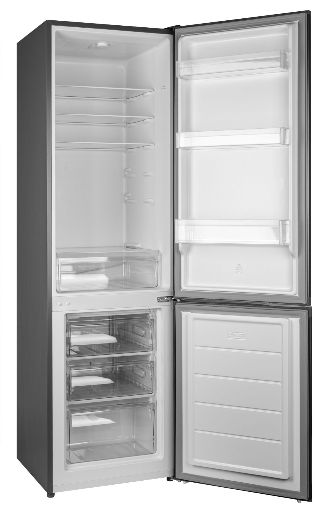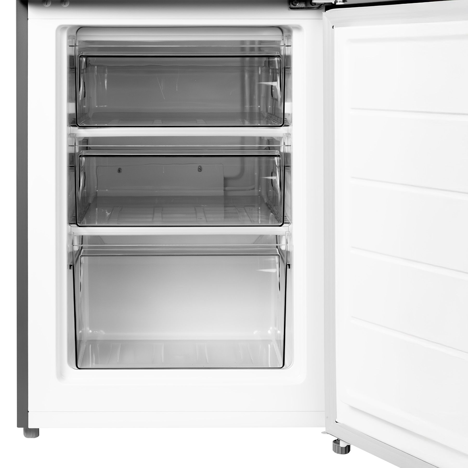 Холодильний відсік має напівпрозорий плафон лампи, що не перешкоджає LED-освітленню, яке розташоване зверху. Три полиці виконані зі скла з пластиковим огранюванням. Є три продуктові пластикові шухляди, один кріспер-бокс із пластику зі скляною кришкою та пластиковим обмеженням. Морозильна камера - це три ящики для заморожування продуктів. За бажання можна додати лоток морозилки, а за додаткову суму - підставку для заморожування льоду й окремий відсік для неї.