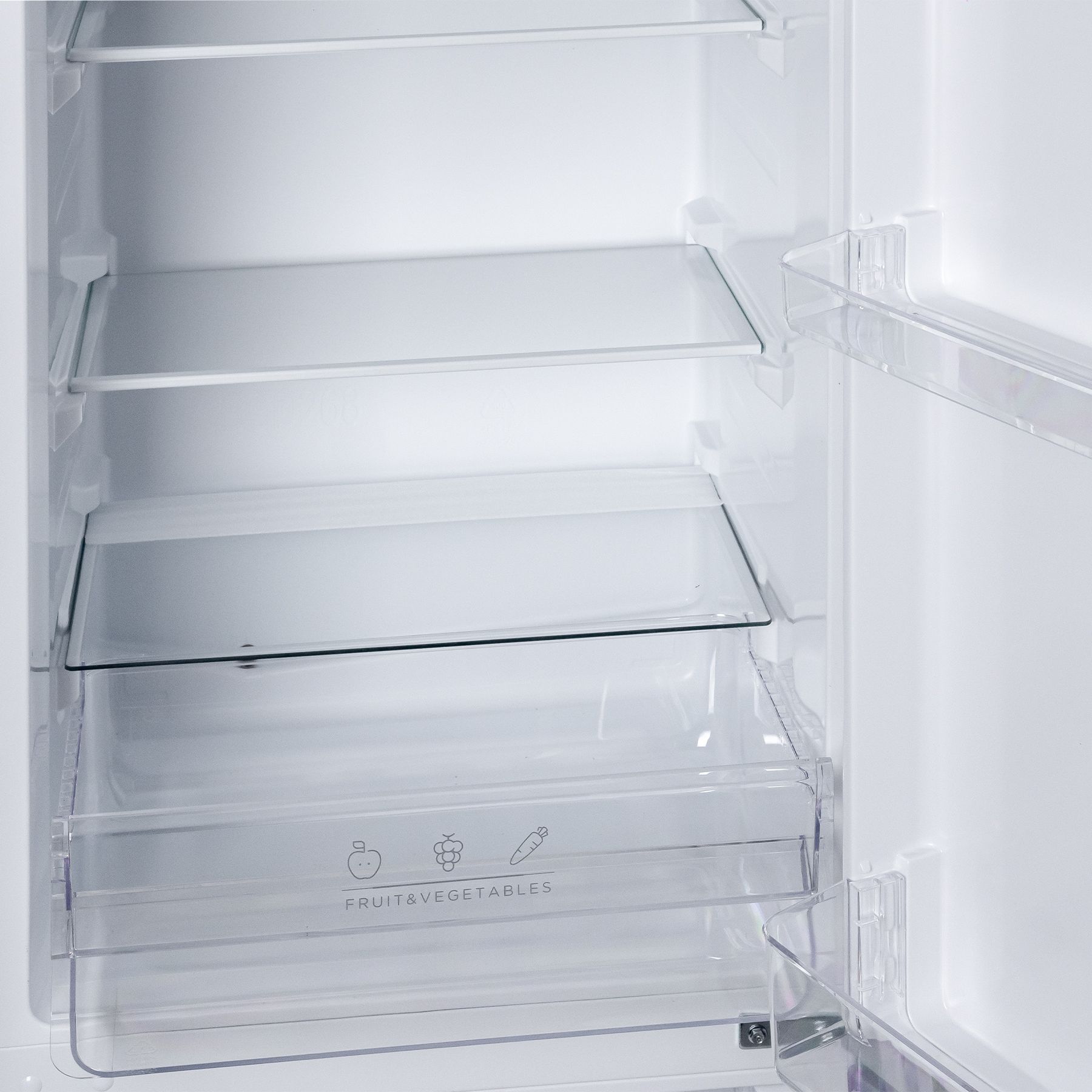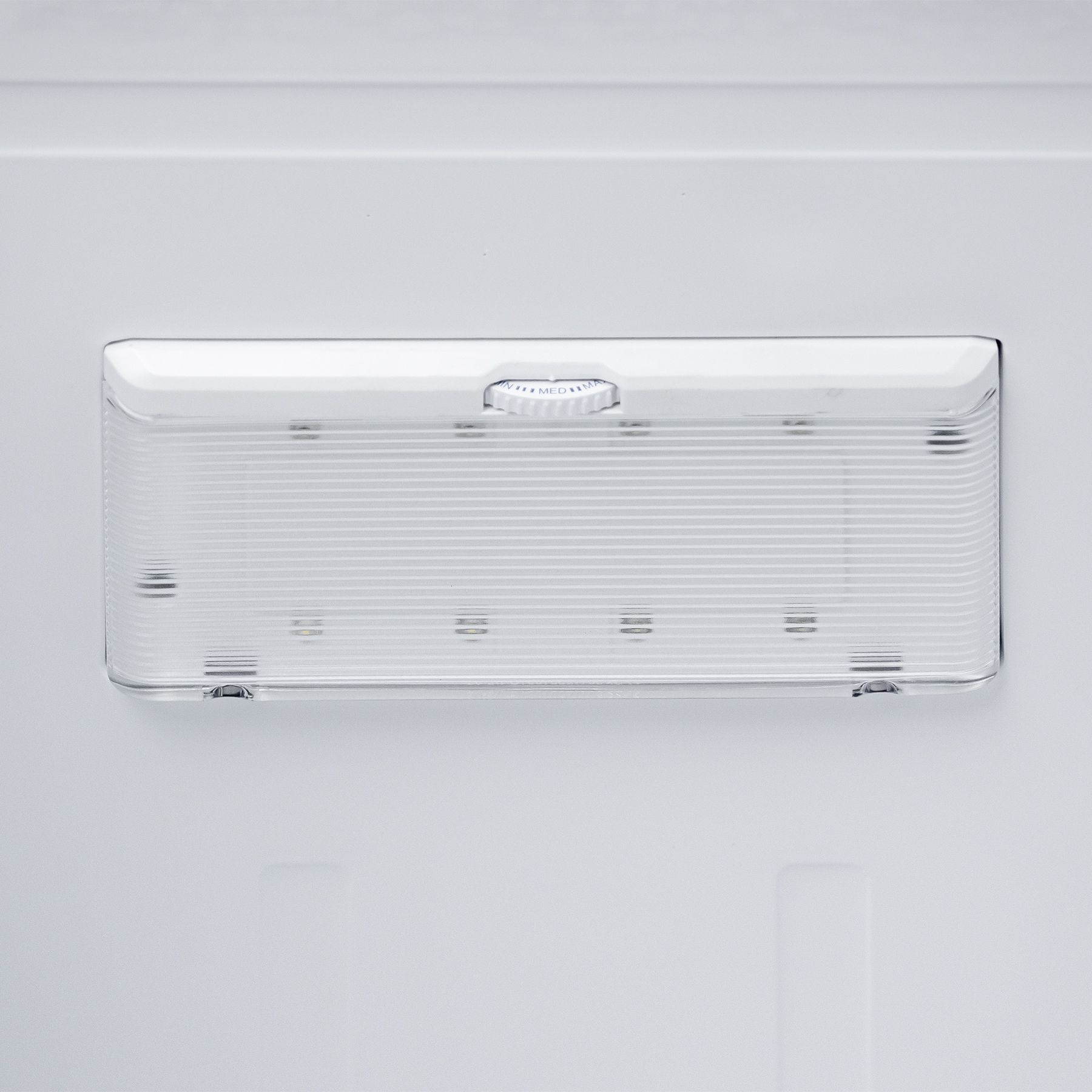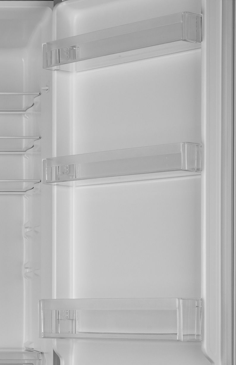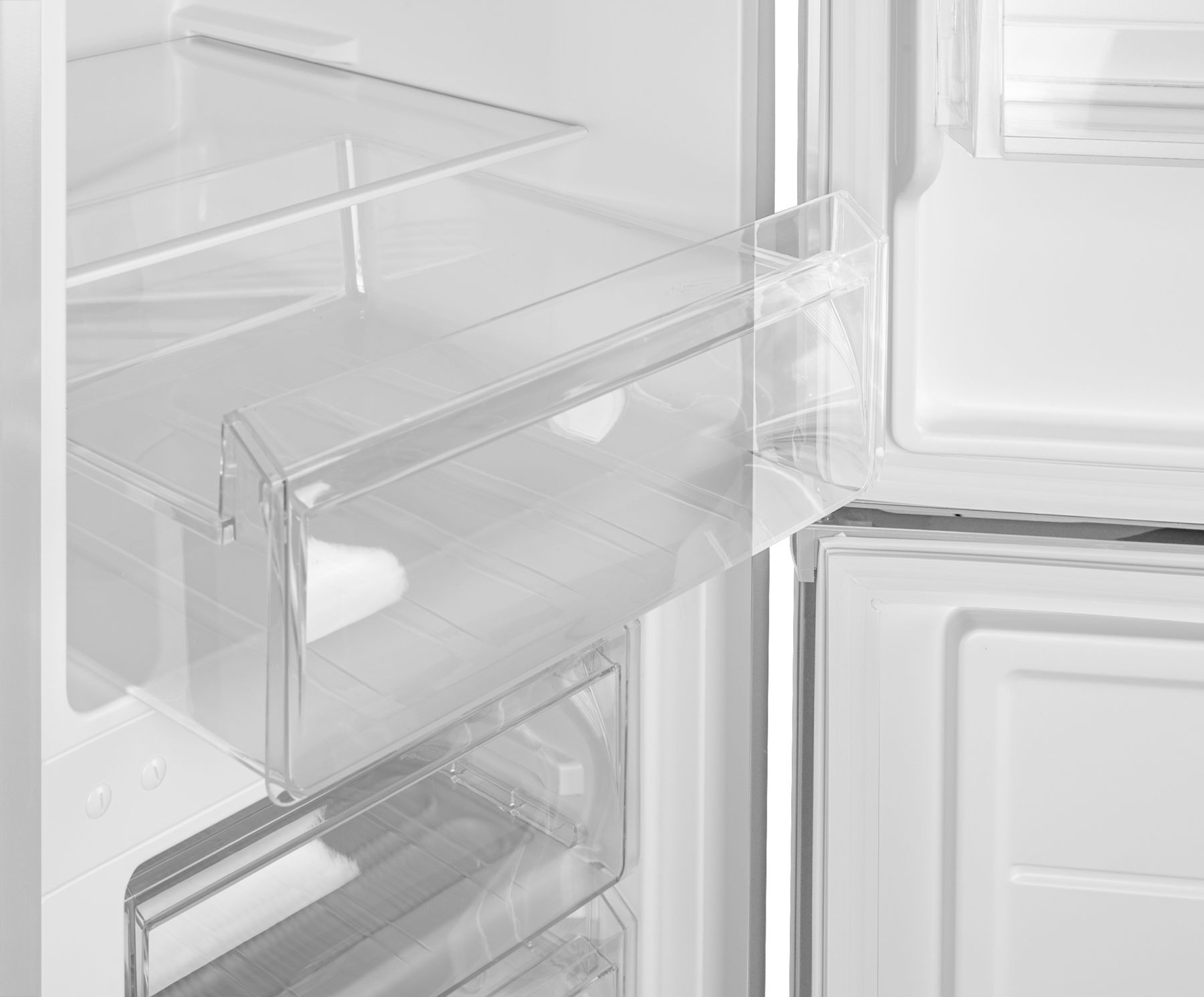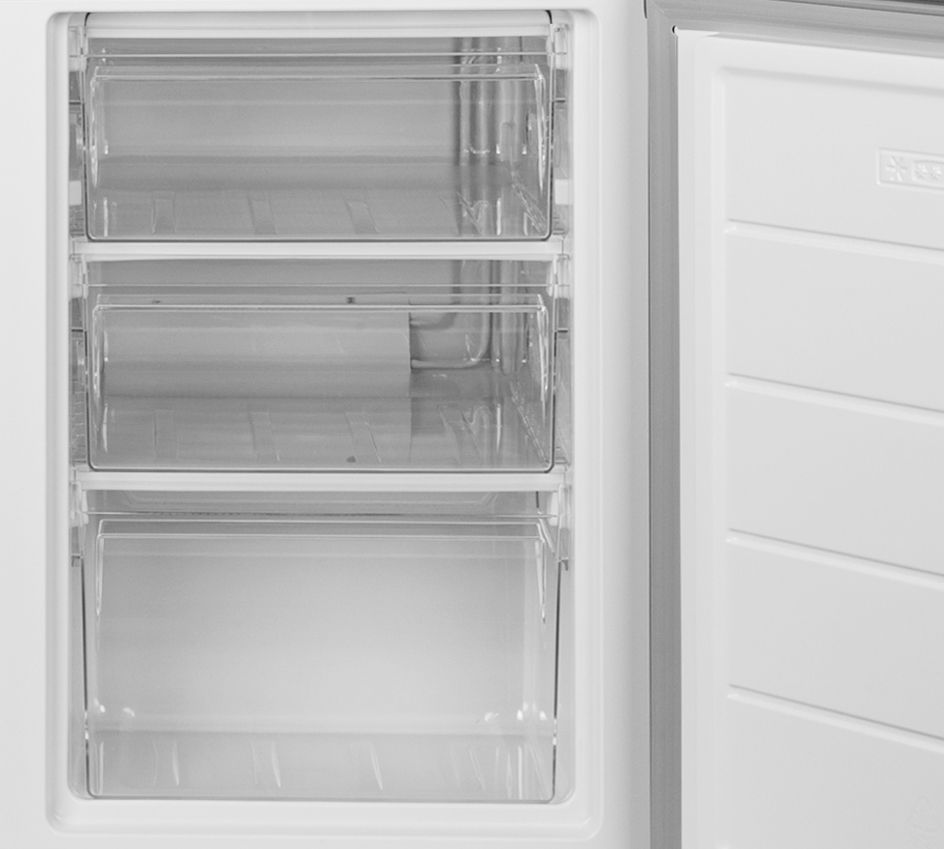 Холодильний відсік має напівпрозорий плафон лампи, що не перешкоджає LED-освітленню, яке розташоване зверху. Три полиці виконані зі скла з пластиковим огранюванням. Є три продуктові пластикові шухляди, один кріспер-бокс із пластику зі скляною кришкою та пластиковим обмеженням. Морозильна камера - це три ящики для заморожування продуктів. За бажання можна додати лоток морозилки, а за додаткову суму - підставку для заморожування льоду й окремий відсік для неї.