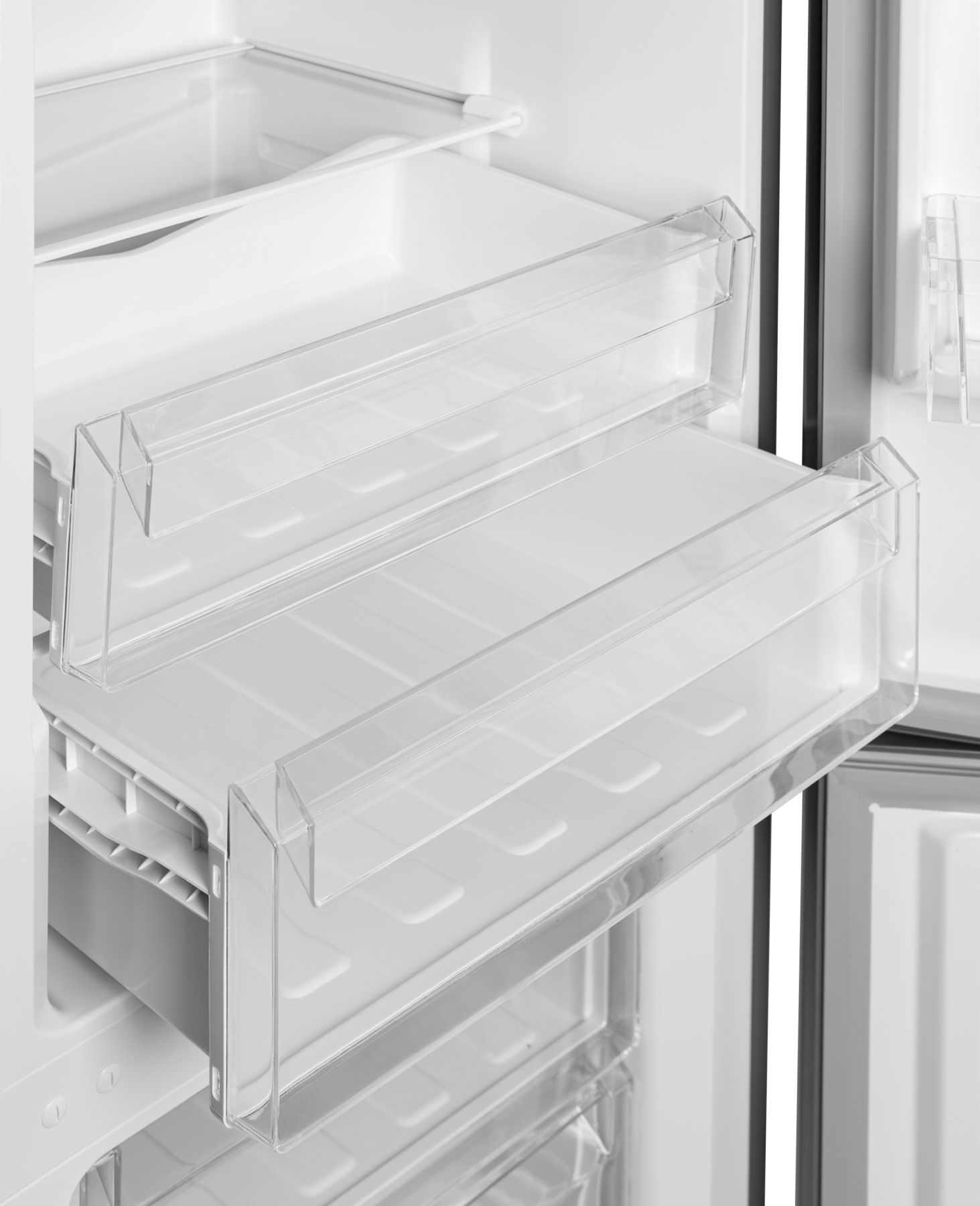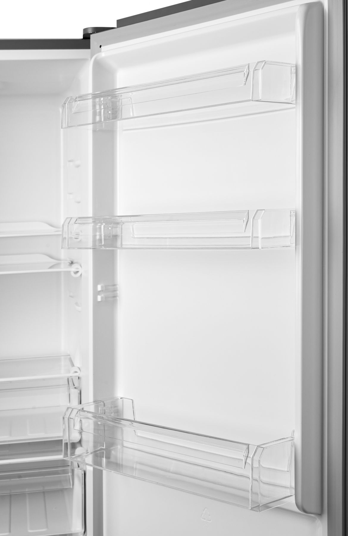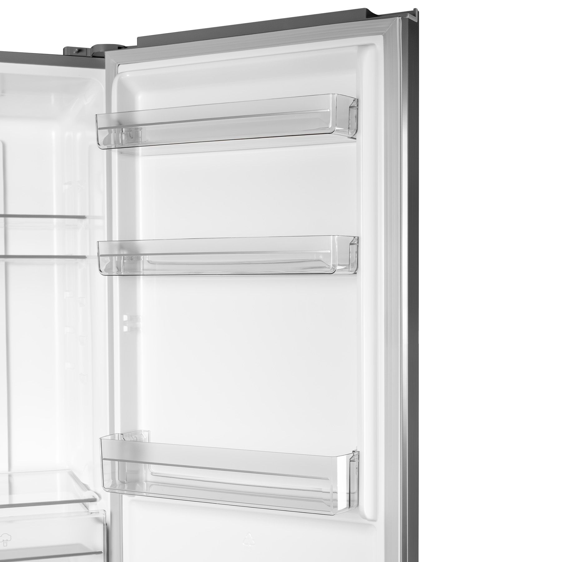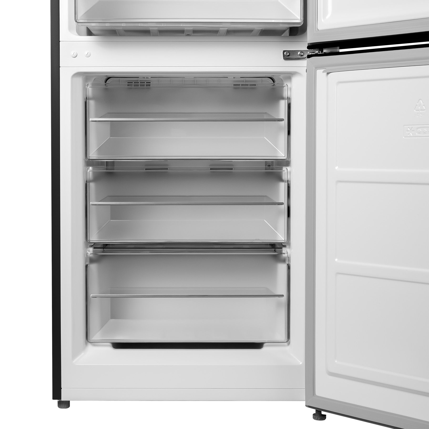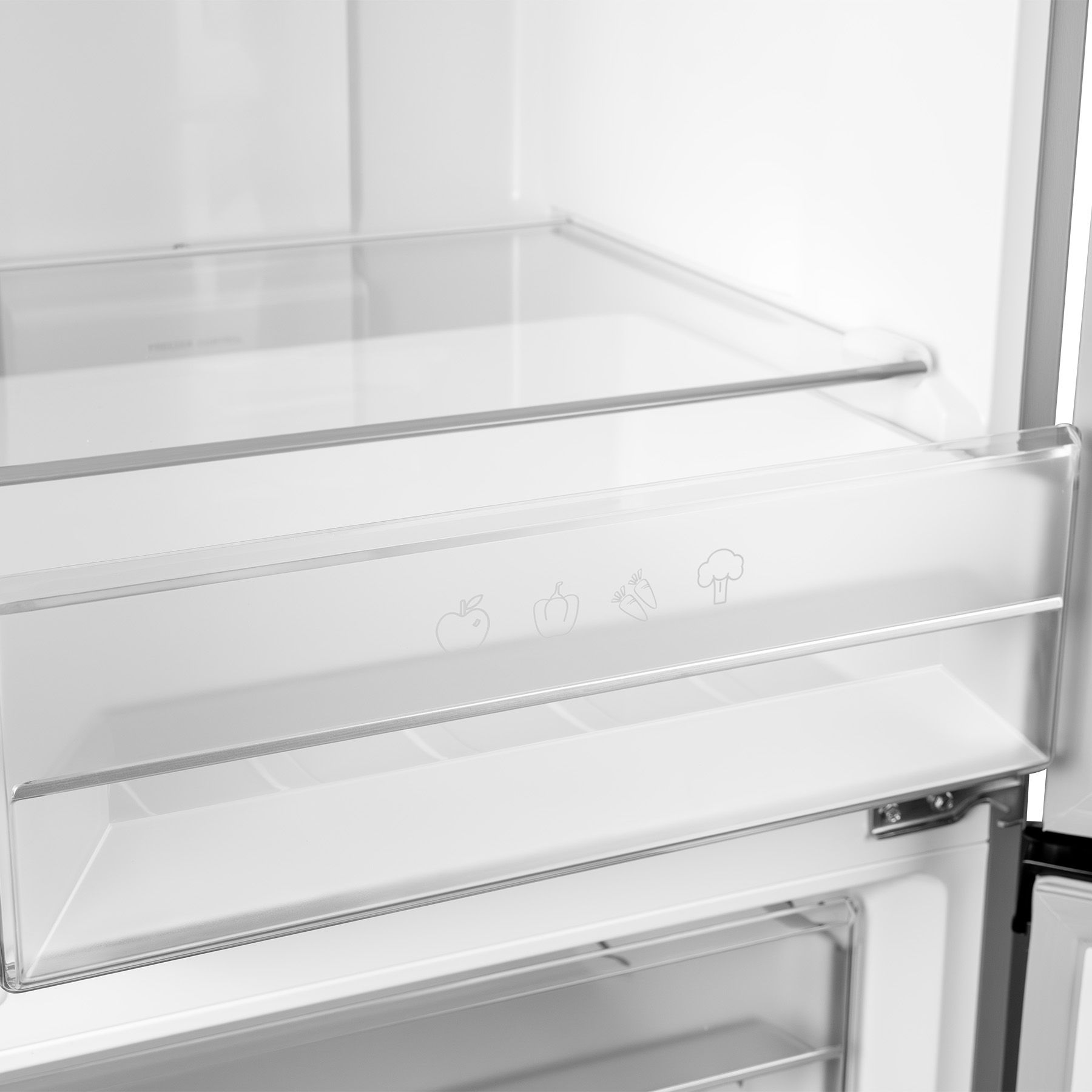 Холодильний відсік зверху освітлюється типом LED і закритий напівпрозорою кришкою. 3 скляні полиці з пластиковими "обідками" вміщують в себе максимальну кількість продуктів. Усередині розташовані панель налаштувань та інтерфейс користувача LED. Морозилка складається з трьох прозорих ящиків.