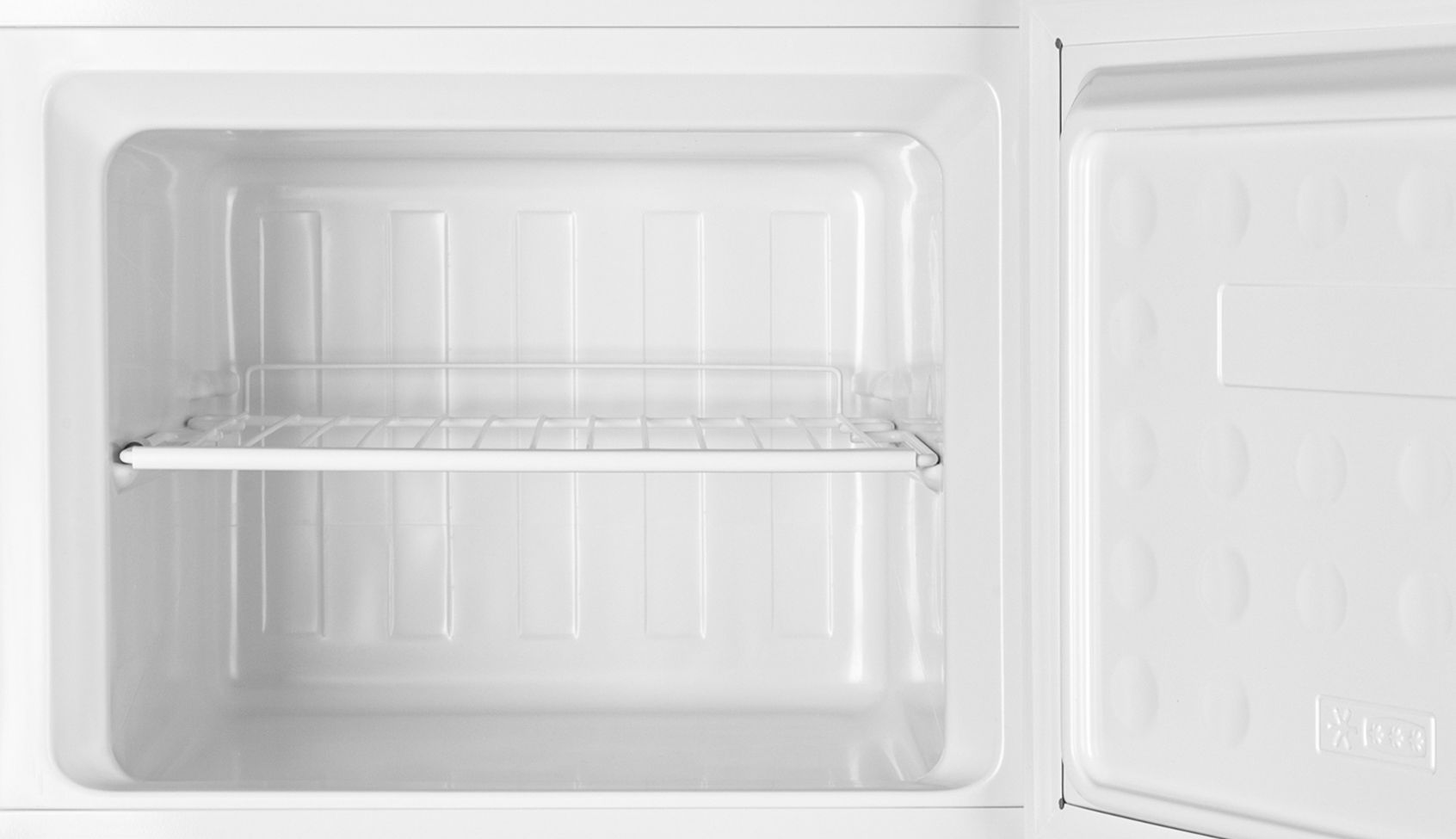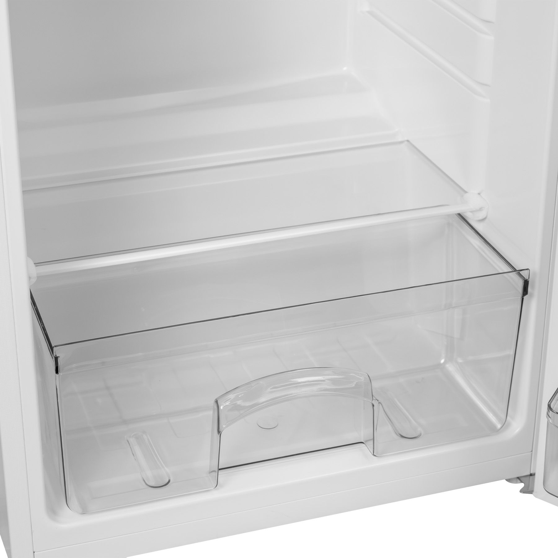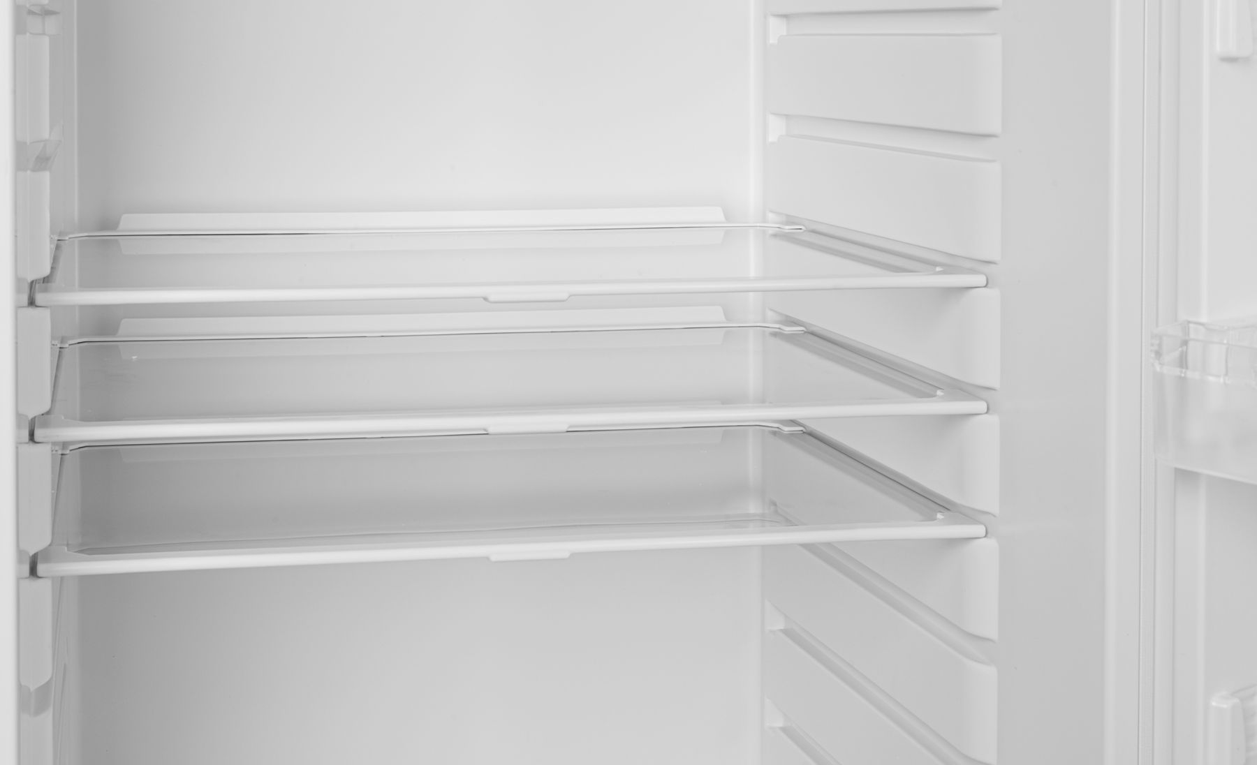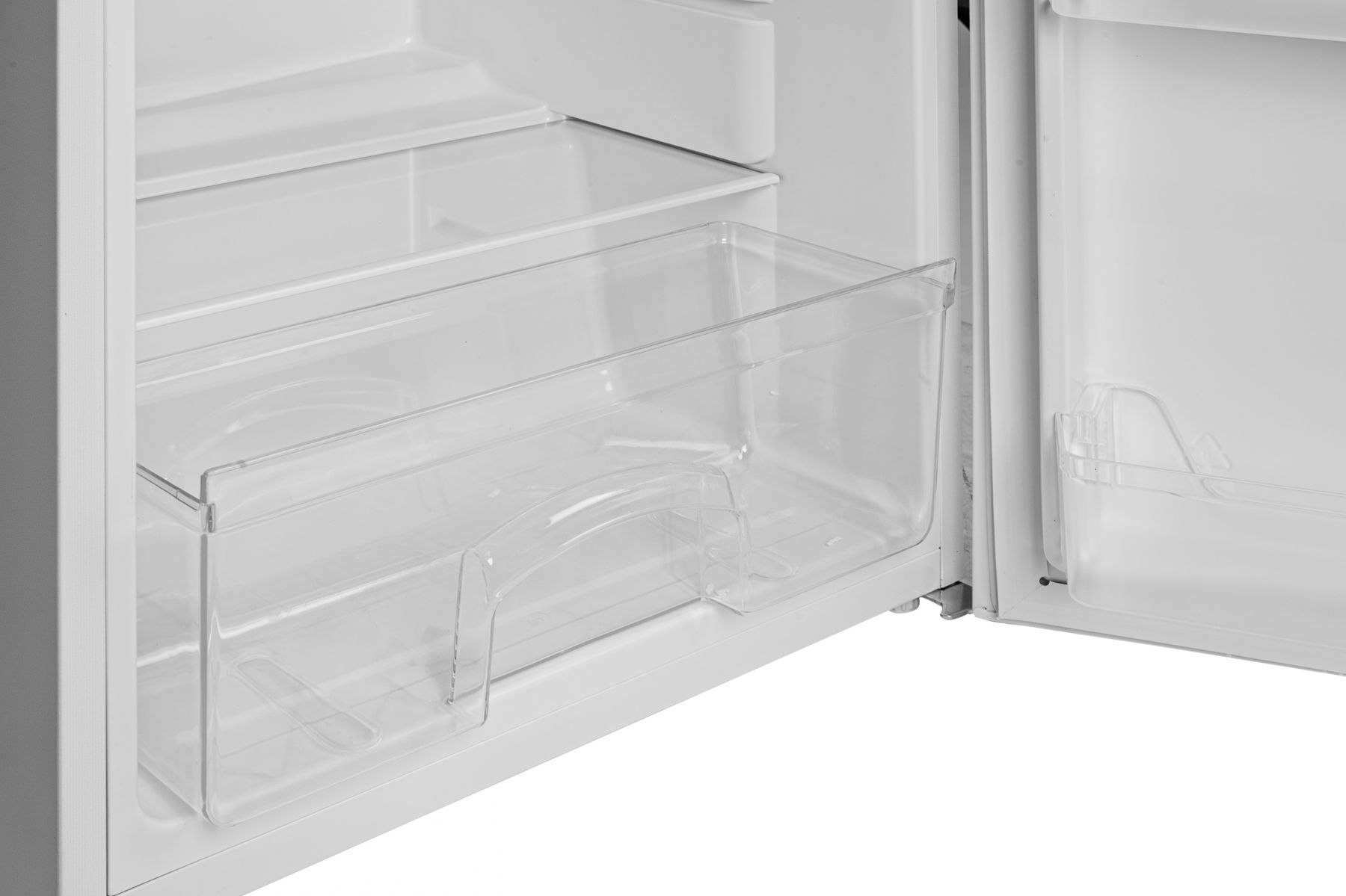 У холодильному відсіку на 199 л контролювати свіжість продуктів можна за допомогою LED-освітлення, що розташоване збоку. Лампа накрита напівпрозорим плафоном. Є три скляні полиці з пластиковою окантовкою, що витримують до 25 кг навантаження. Профіль передніх полиць - прозорий, задніх - білий. Чотири пластикові шухляди розташовані внизу для зберігання більших продуктів. Кріспер бокс скляний, щоб зберігати свіжість овочів або фруктів, зелені. Докупити можна підставку під яйця і пляшки з рідинами, масницю. Ящики в морозилці на 50 л відсутні, їх повноцінно замінює одна решітка, створюючи два відділи для заморозки. Додатково можна купити підставку для заморозки льоду.