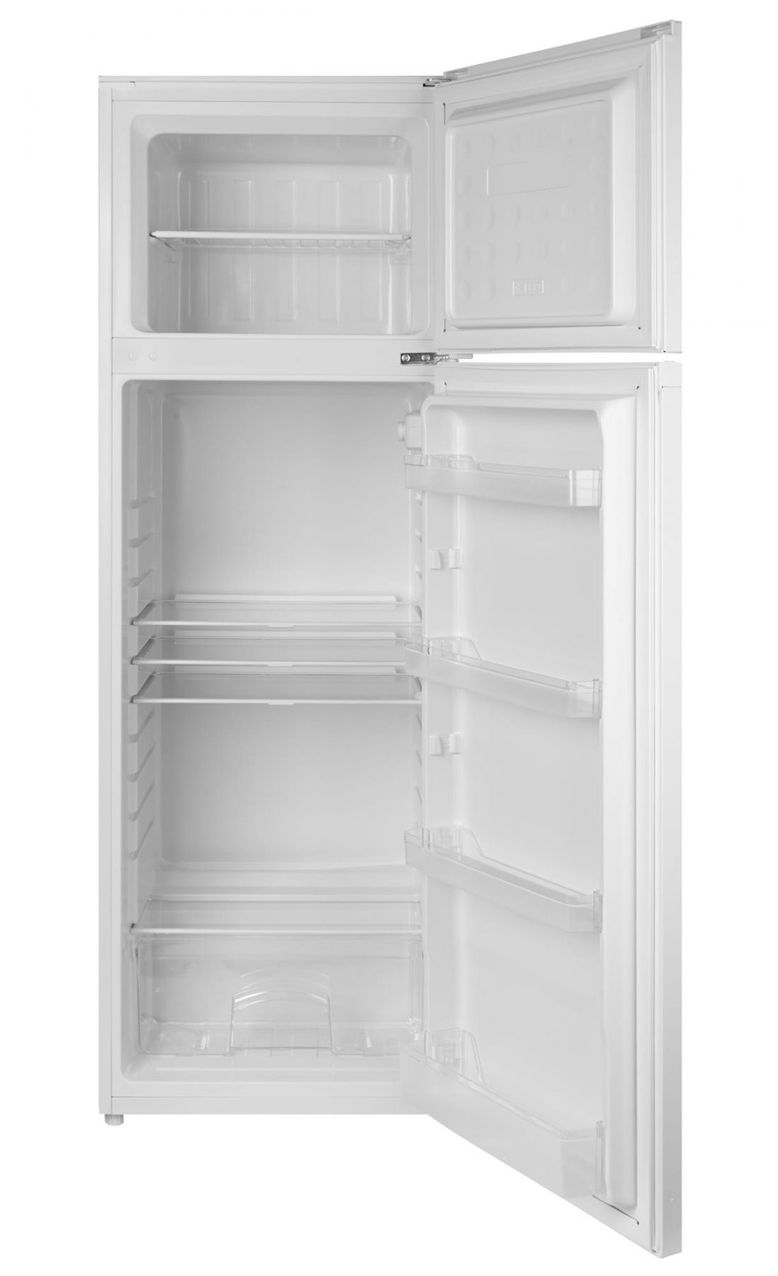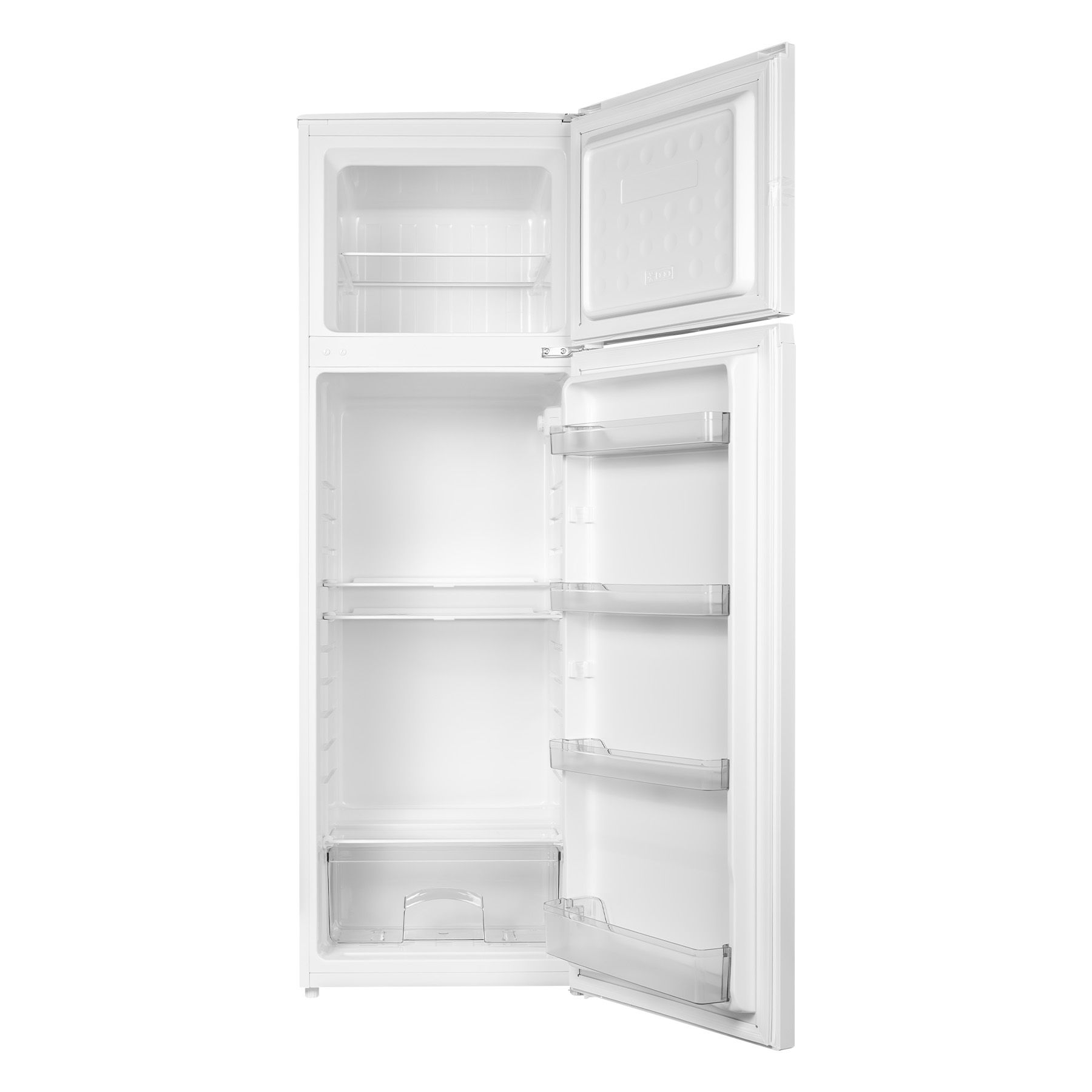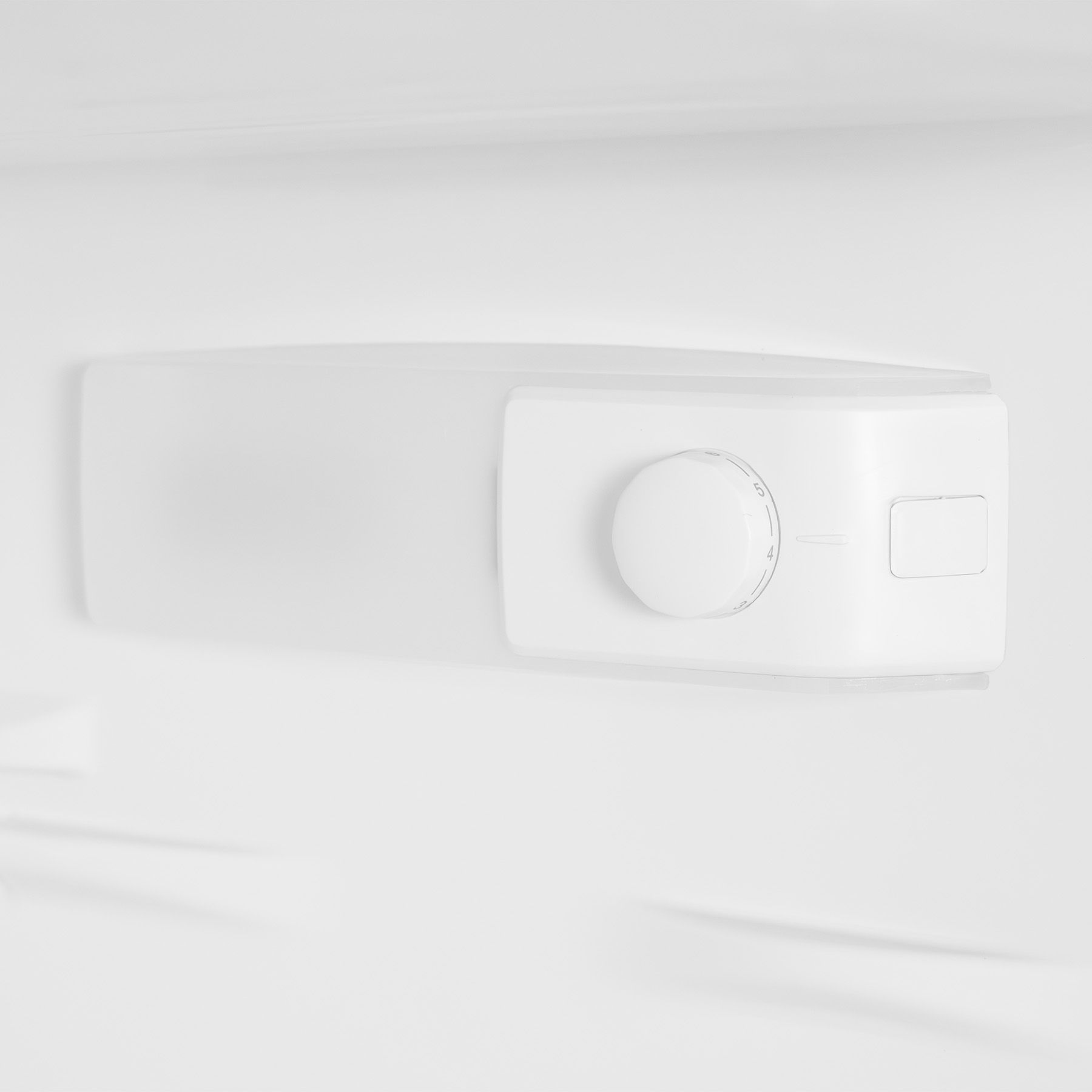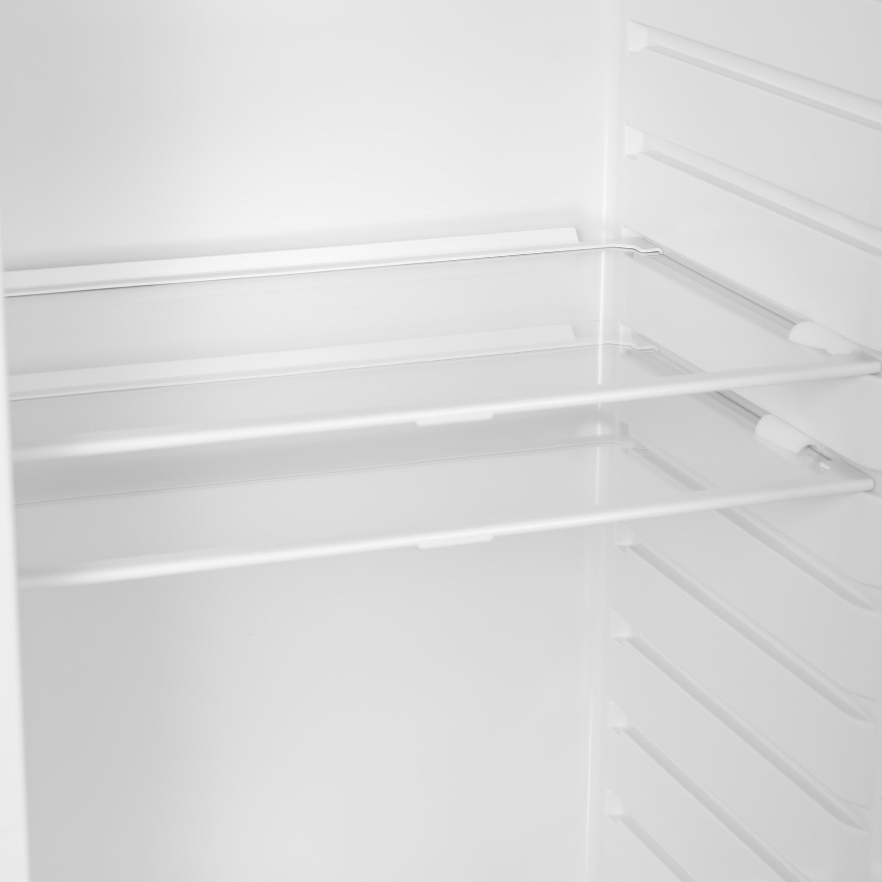У холодильному відсіку на 199 л контролювати свіжість продуктів можна за допомогою LED-освітлення, що розташоване збоку. Лампа накрита напівпрозорим плафоном. Є три скляні полиці з пластиковою окантовкою, що витримують до 25 кг навантаження. Профіль передніх полиць - прозорий, задніх - білий. Чотири пластикові шухляди розташовані внизу для зберігання більших продуктів. Кріспер бокс скляний, щоб зберігати свіжість овочів або фруктів, зелені. Докупити можна підставку під яйця і пляшки з рідинами, масницю. Ящики в морозилці на 50 л відсутні, їх повноцінно замінює одна решітка, створюючи два відділи для заморозки. Додатково можна купити підставку для заморозки льоду.