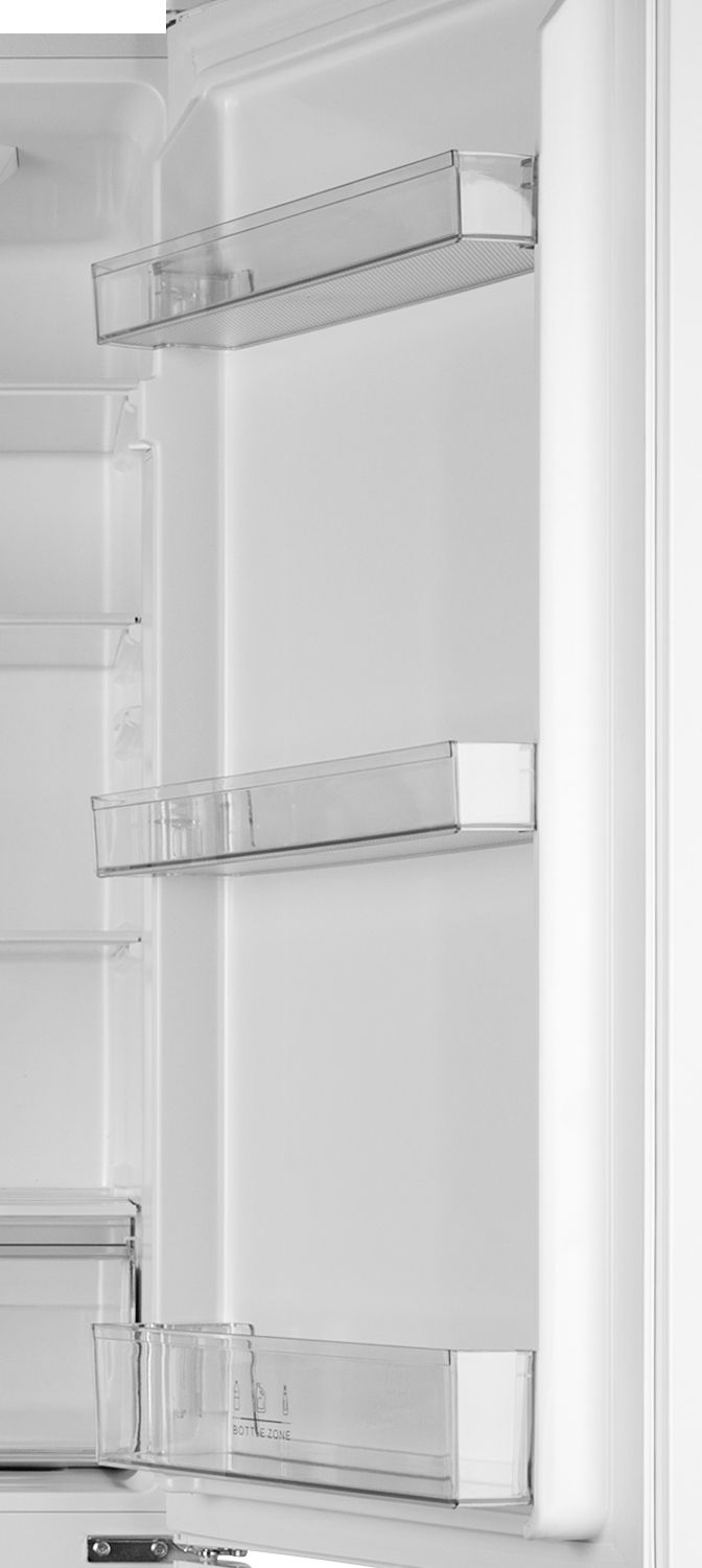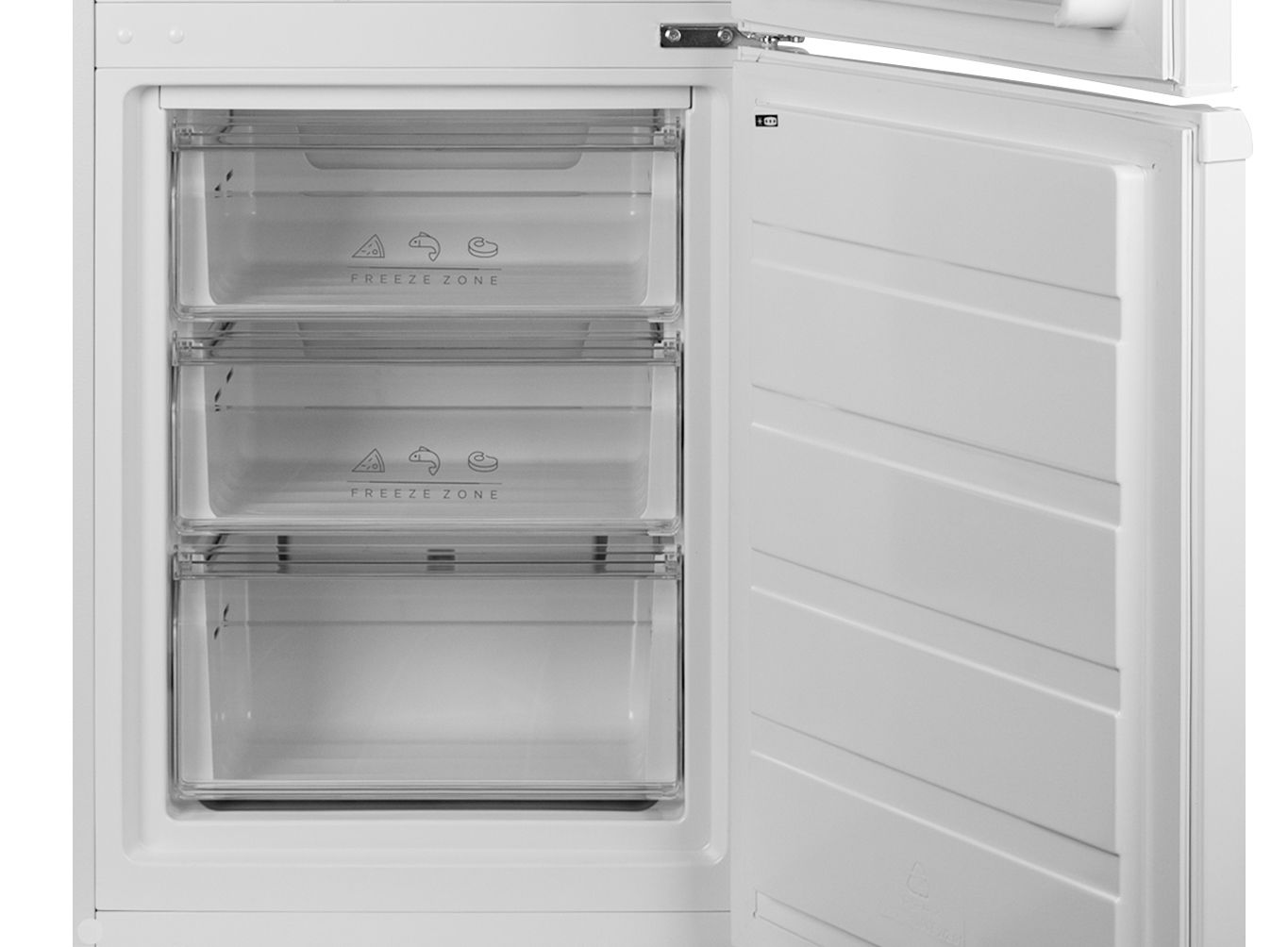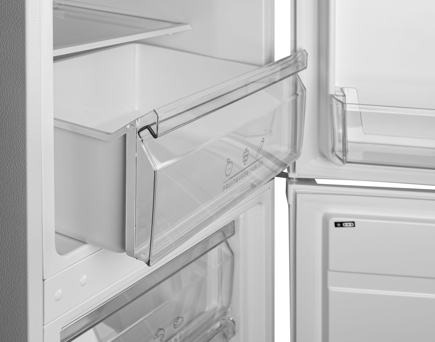 Місткість відсіку для свіжих продуктів до 199 літрів дозволяє розмістити всередині все, що необхідно родині з 4-5 осіб. Тут передбачено чотири скляні полиці, що регулюються за висотою, а також ящик для овочів та фруктів. На дверцятах три окремі пластикові ніші для зберігання яєць, соусів та пляшок з напоями. Морозильна камера на 71 літр має три ящики (два менших і один більший), щоб глибоко заморозити якомога більше м’яса, фруктів, овочів та риби.
