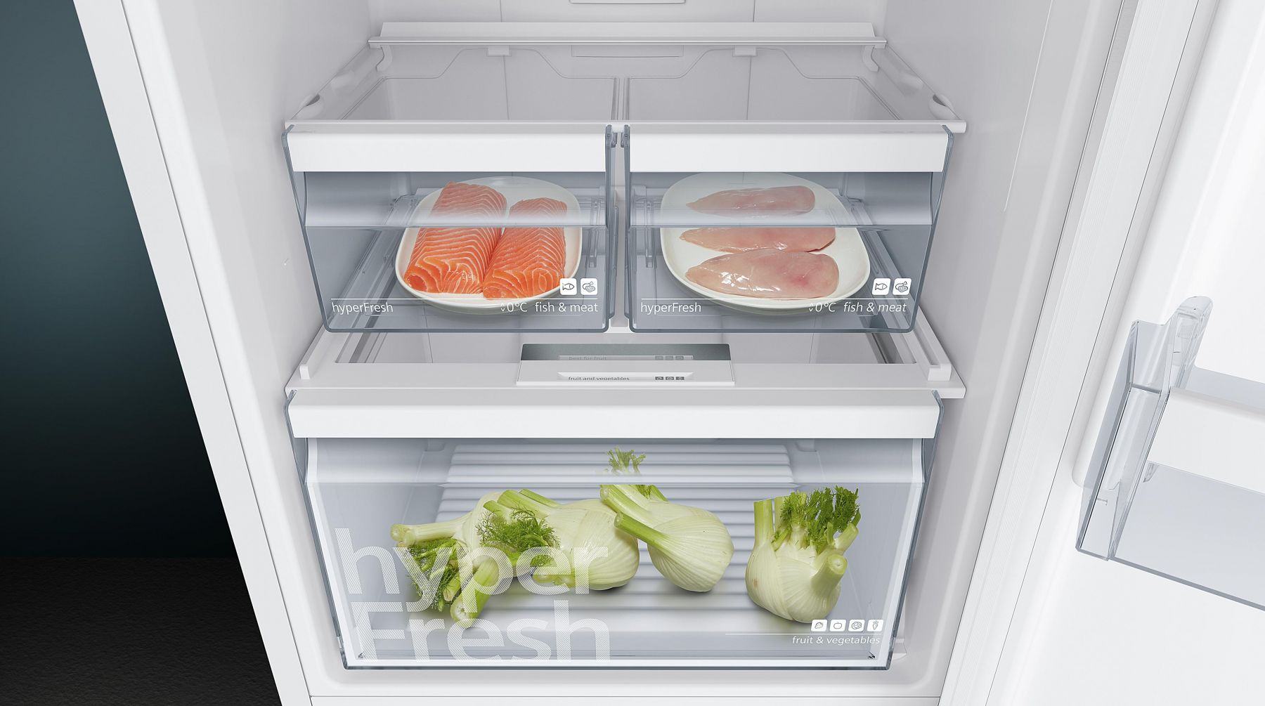В залежності від коливань зовнішньої температури та частоти відчинення дверцят, у холодильному відділенні постійно змінюється температура. Інтелектуальні сенсори freshSense миттєво реагують на зміну температурних умов та автоматично регулюють оптимальну температуру всередині холодильної камери, щоб ваші продукти збурагалися свіжими ще довше.