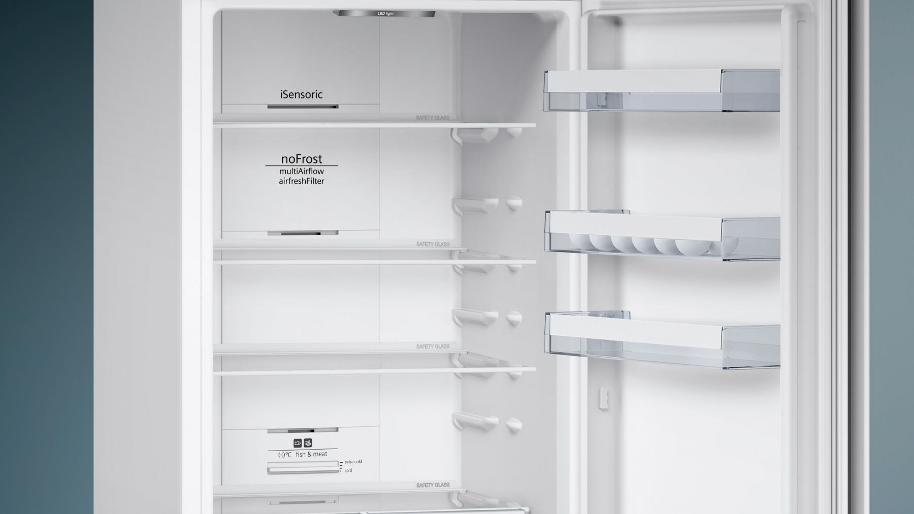 Холодильник Siemens оснащенний полицями, виготовленими з надміцного загартованого скла, за яким просто та легко доглядати. Якщо навіть щось і проллється у холодильному відділенні, рідина не протікатиме у інші відділення холодильника, а залишатиметься в одному місці. А при розбиванні полиці, скло не розсипається та дрібні уламки, тому ви не зможете поранитися склом.