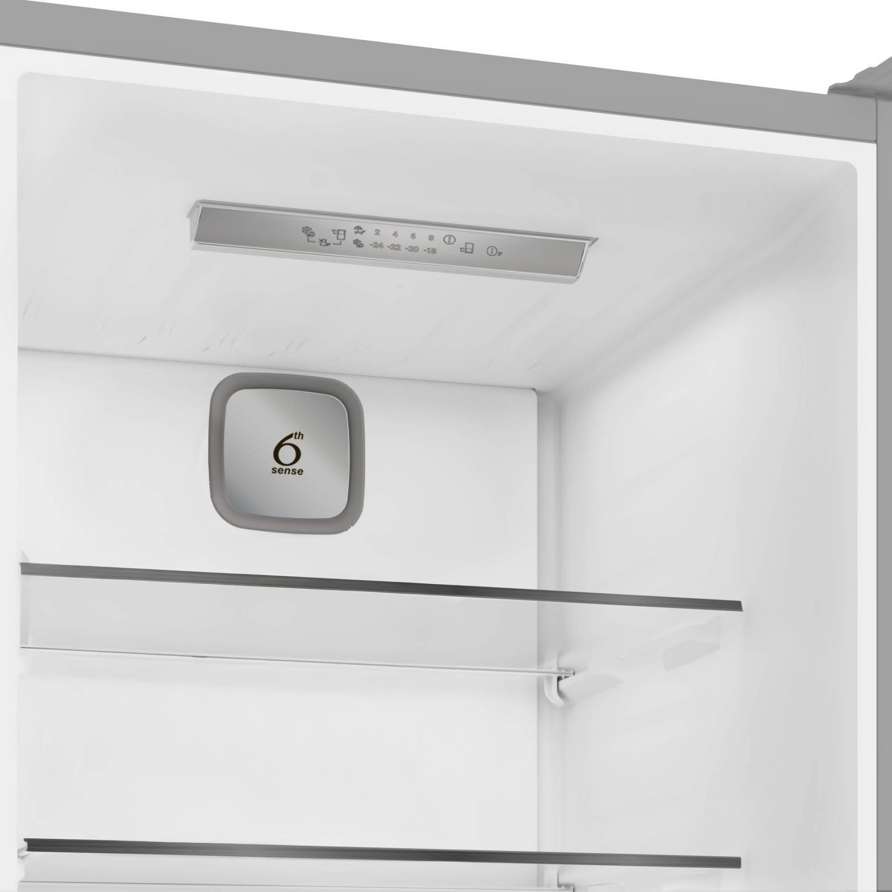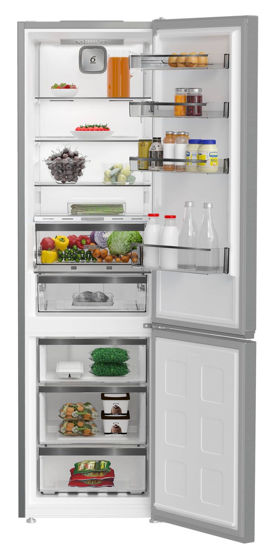 Серед додаткових функцій — режим «Еко», швидке заморожування, режим «Відпустка», а також звукові сигнали при відкритих дверцятах і підвищенні температури, що допомагає зберегти продукти у безпеці. Внутрішнє оснащення включає 4 міцні скляні полиці, 4 дверні кошики, 2 контейнери для овочів і підвісну полицю для пляшок. Все освітлюється яскравим і енергоощадним LED-підсвічуванням. Морозильна камера поділена на 3 секції, має потужність заморожування до 6 кг на добу та зберігає холод до 11 годин у разі вимкнення електроенергії.