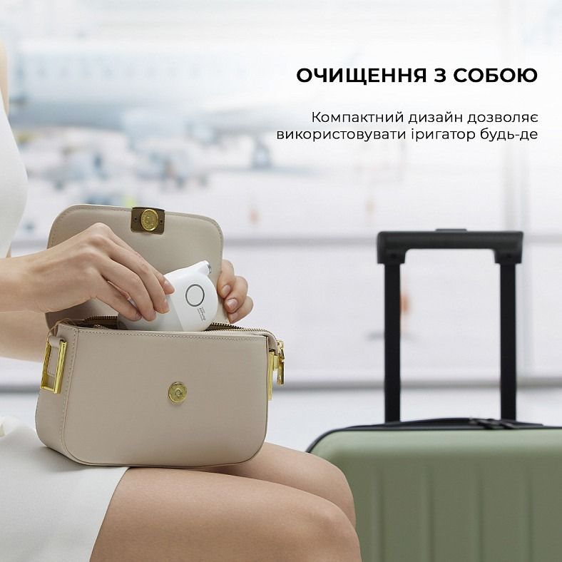 Насолоджуйтесь чищенням на ходу завдяки портативному дизайну розміром з долоню, пристрій настільки ж компактний, як і стандартний смартфон. Іригатор легко поміститься у вашій кишені. Чистіть зуби на ходу!
