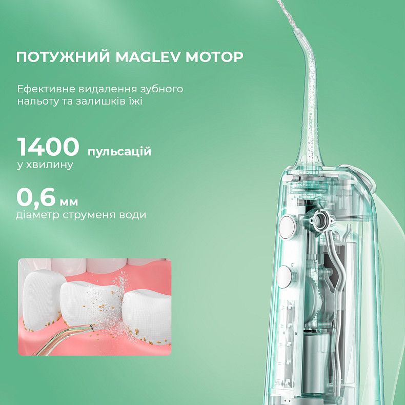 Oclean W10 має сучасний двигун на магнітній підвісці, і завдяки імпульсній технології створює високочастотні коливання до 1400 разів за хвилину. Таке ідеальне комбо — секрет якісного догляду. Бо навіть у вузьких міжзубних проміжках, де безсила звичайна зубна щітка, Oclean W10 впорається на всі 100%. А від сильного водяного струменя діаметром 0,6 мм не сховаються жодні залишки їжі.