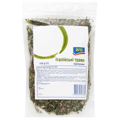 Aro Італійські трави 100г. Суха приправа до страв. Склад: душиця сушена, базилік сушений, чабер сушений, цибуля зелена сушена, часник гранульований. Країна походження: Україна.Зберігати в сухих, чистих приміщеннях з працездатною вентиляцією, не заражених шкідниками, за температури не вище 20°C та відносній вологості повітря не більше 75%. Строк придатності 12 місяців. Маса нетто 100 г -4,5г.