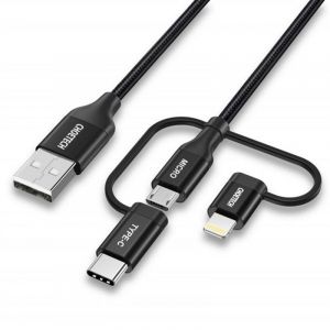 USB-кабель 3-в-1: цей кабель має три вихідні конектори, в тому числі один конектор Type-C, один 8-контактний конектор Lightning (сертифікований MFI) і один конектор Micro USB. Три типи конекторів досить універсальні для повсякденного використання, що позбавляє необхідності носити з собою багато кабелів для різних пристроїв