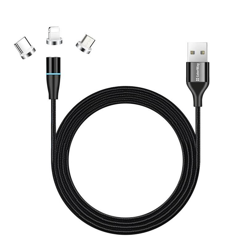 Кабель ColorWay Magnetic USB-Lightning + microUSB + USB-C Magnetic Data/Quick Charge, 2.4А, 1м, Black (CW-CBUU038-BK)
