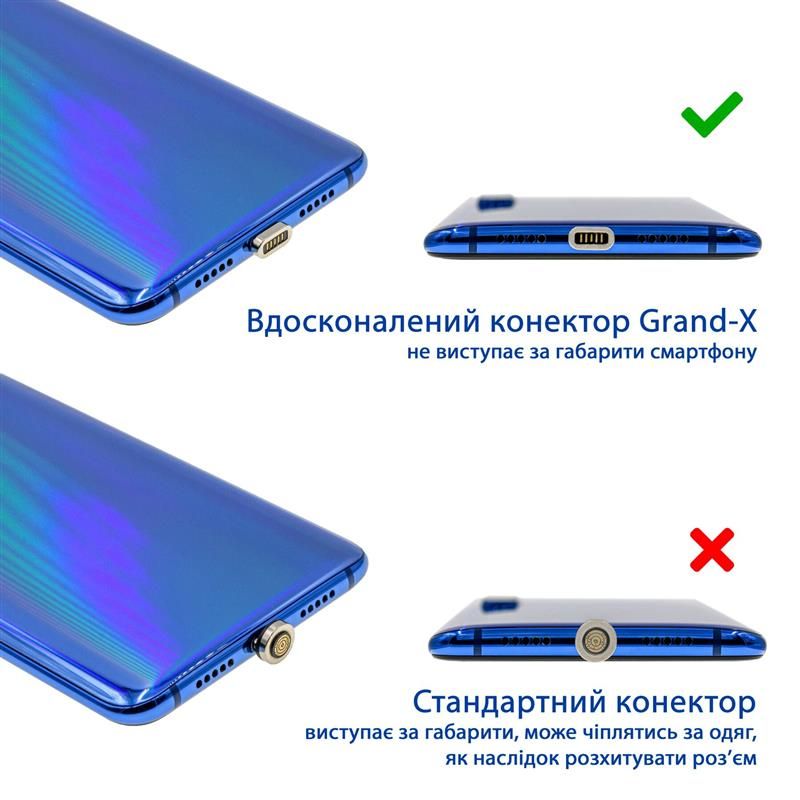 Новий магнітний кабель Grand-X дозволить Вам заряджати свій пристрій підключаючи кабель одним максимально простим рухом. Кабель дає додаткову безпеку: Вы можете бути впевненим, що в випадку непередбачуваної ситуації, коли за кабель різко смикнули, він не пошкодить роз"єм, його магніт просто від"єднається від пристрою, що дозволить зберегти Ваш телефон чи планшет в цілосності, і уникнути візиту до сервисного центру для заміни роз"єму зарядки. На відміну від багатьох аналогів на ринку, магнітні кабеля мають овальні , а не круглі коннектори котрі вставляються в телефон, вони вже не виступають за края, не чіпляються за предмети, додаючи безпеки роз"єму. Внутрішня товщина конектору, котрий вставляється в роз"єм телефону підібрана таким чином, що він витянеться з роз"єму магнітом якщо Вы прямо тяннете его і від"єднається, якщо Ви зробите боковий рух.Це дуже зручно.