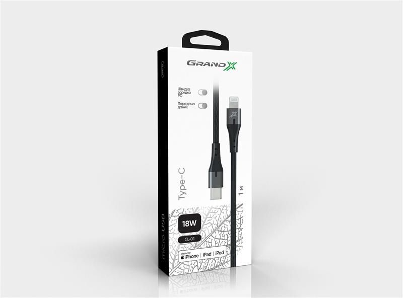 Кабель Grand-X USB Type-C - Lightning (M/M), MFI, Power Delivery 18W, 1 м, Gray (CL-01)
